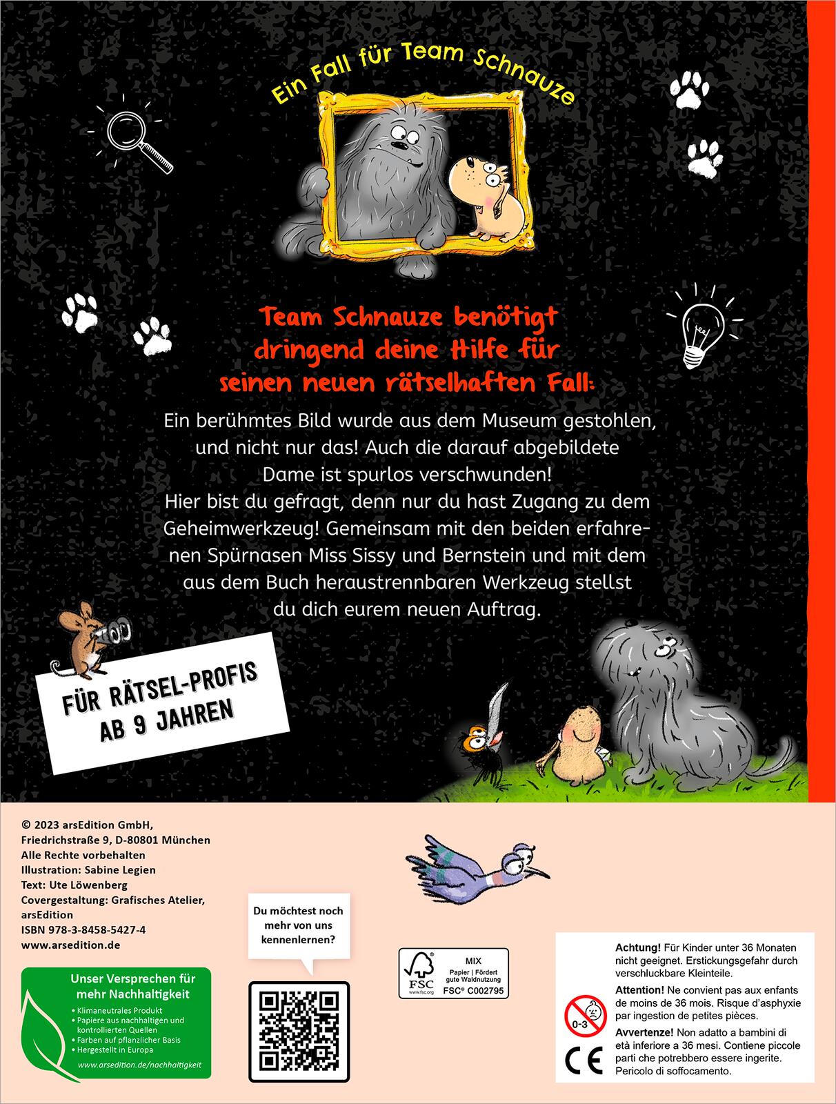 Team Schnauze benötigt dringend deine Hilfe für ihren neuen rätselhaften Fall: Ein berühmtes Bild wurde aus dem Museum gestohlen! Hier bist du gefragt, denn nur du hast Zugang zu dem Geheimwerkzeug! Gemeinsam mit den beiden erfahrenen Spürnasen Miss Sissy und Bernstein und mit dem aus dem Buch heraustrennbaren Werkzeug, mit dem sich wirklich jeder Code knacken lässt, stellst du dich eurem neuen Auftrag.