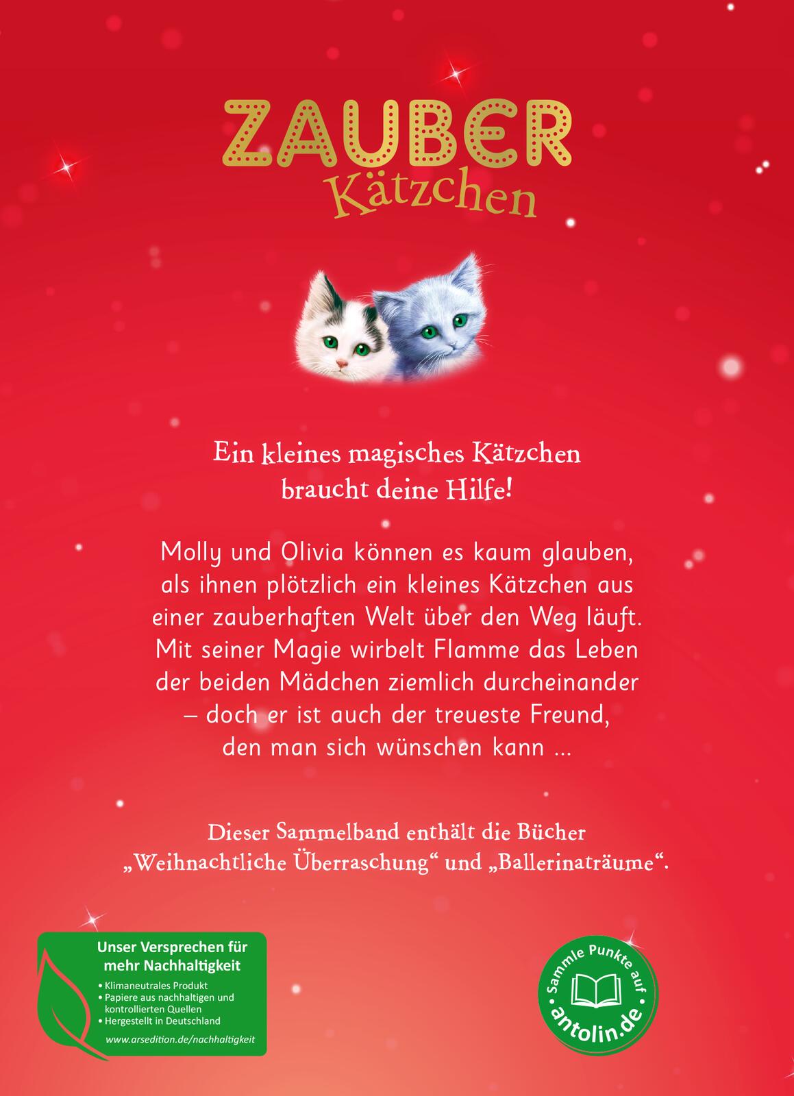 Dieser Sammelband enthält den Band "Zauberkätzchen - Weihnachtliche Überraschung" und den Band "Zauberkätzchen - Ballerinaträume" der "Zauberkätzchen"-Reihe.