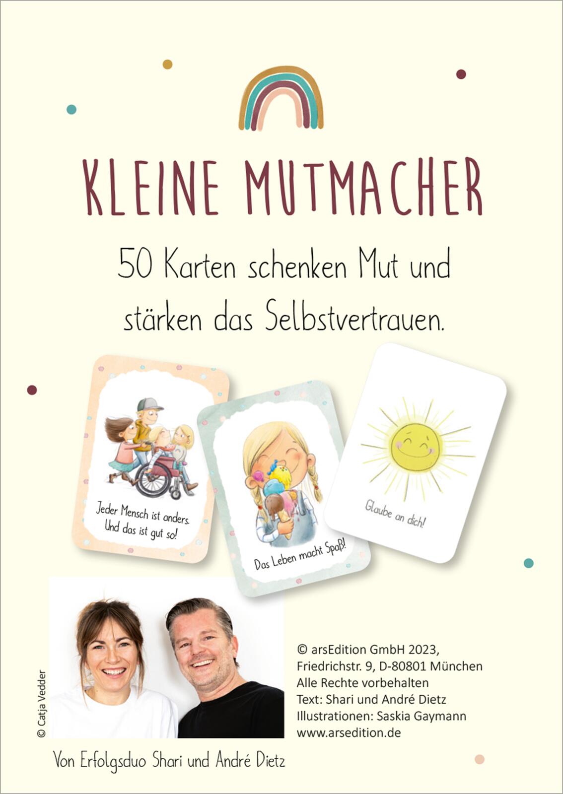 | Schlagworte | aufmunterung kind • Diversität Kinder • Erster Schultag • geschenk erster kindergartentag • Geschenk zur Einschulung • Inklusion • Kartenbox • kind emotional stärken • mut machen kinder • mutmachkärtchen • mutmachkärtchen für kinder • mutmachkarten • mutmachkarten für Kinder • positive Affirmationen • positive Energie • positive Glaubensätze • selbstbewusste Kinder • selbstbewusstsein kinder • Selbstbewusstsein stärken Kinder |