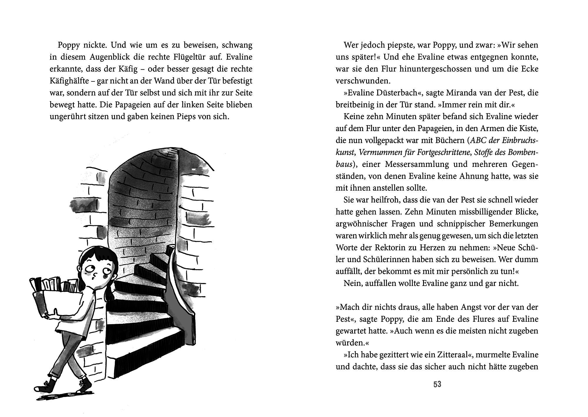 Evaline Düsterbach ist freundlich, höflich und kann keiner Fliege was zuleide tun. Das alles wäre ja nicht so schlimm, wenn nicht alle anderen Familienmitglieder waschechte Autodiebe wären. Da bleibt nur eins: Evaline soll auf der Schule des abgrundtief Bösen das Zeug zu einer gewieften Verbrecherin erlernen. Doch statt beim Einbruchsklettern oder Fluchtplanschmieden zu glänzen, kommt Evaline einem Geheimnis auf die Spur, dessen Enthüllung den Ruf der Schule ein für alle Mal ruinieren könnte.