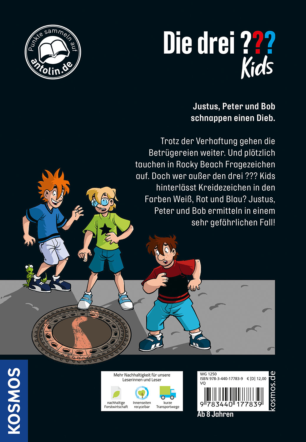 Justus, Peter und Bob schnappen einen dreisten Briefkasten-Dieb. Die Betrügereien gehen aber weiter. Wer ist die Komplizin, die mit Kreide Zeichen malt? Die Detektive ermitteln in einem kniffligen Fall. Ein Leseerlebnis für Kinder ab 8 Jahren.