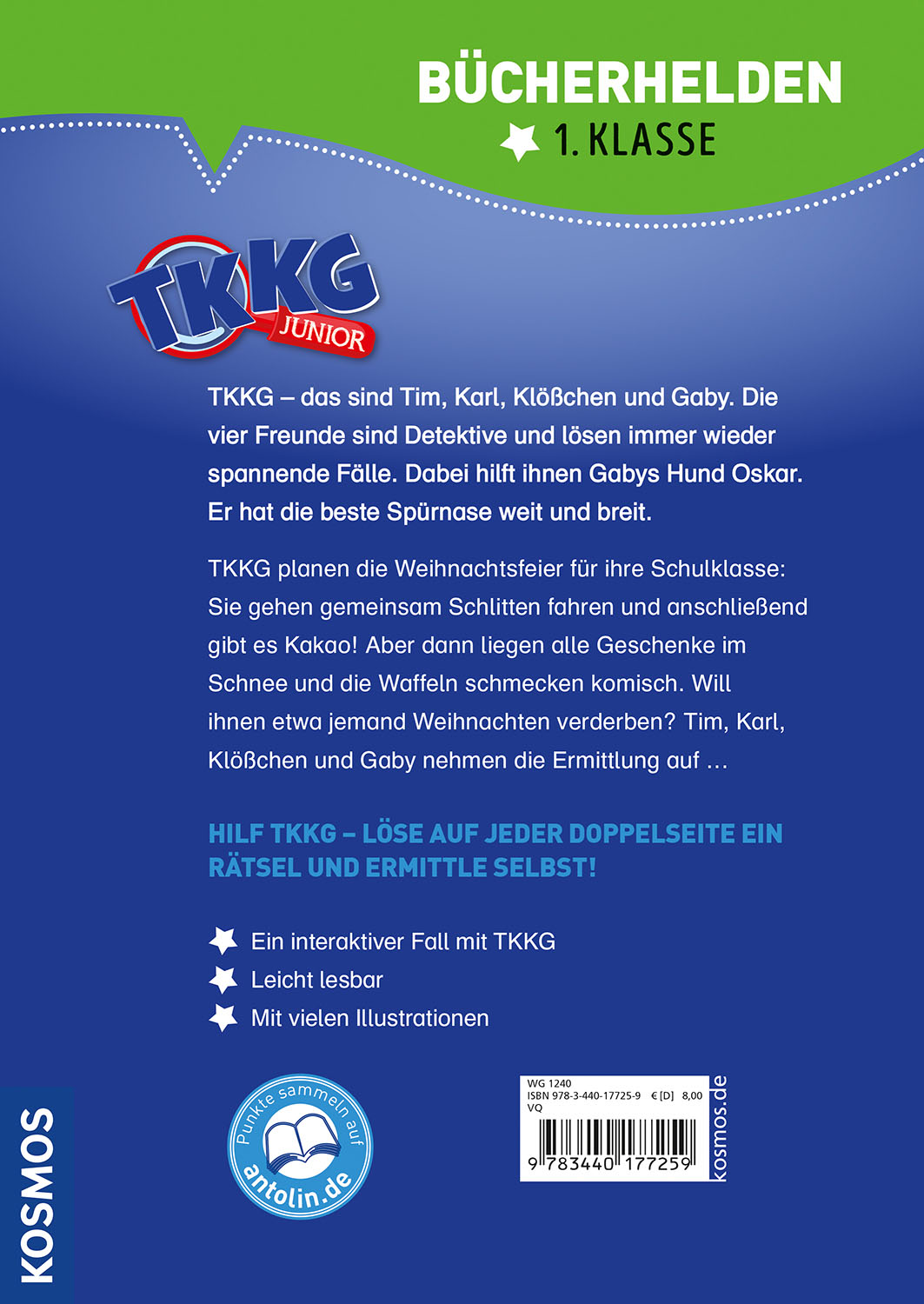 Wer hat die Waffeln versalzen? Warum liegen die Geschenke im Schnee? Ein spannender Fall für TKKG! Die Freunde ermitteln auf der Klassen-Weihnachtsfeier. Erstleser ab der ersten Klasse helfen ihnen dabei. Sie lesen den Bücherhelden-Krimi und lösen auf jeder Doppelseite ein Rätsel.