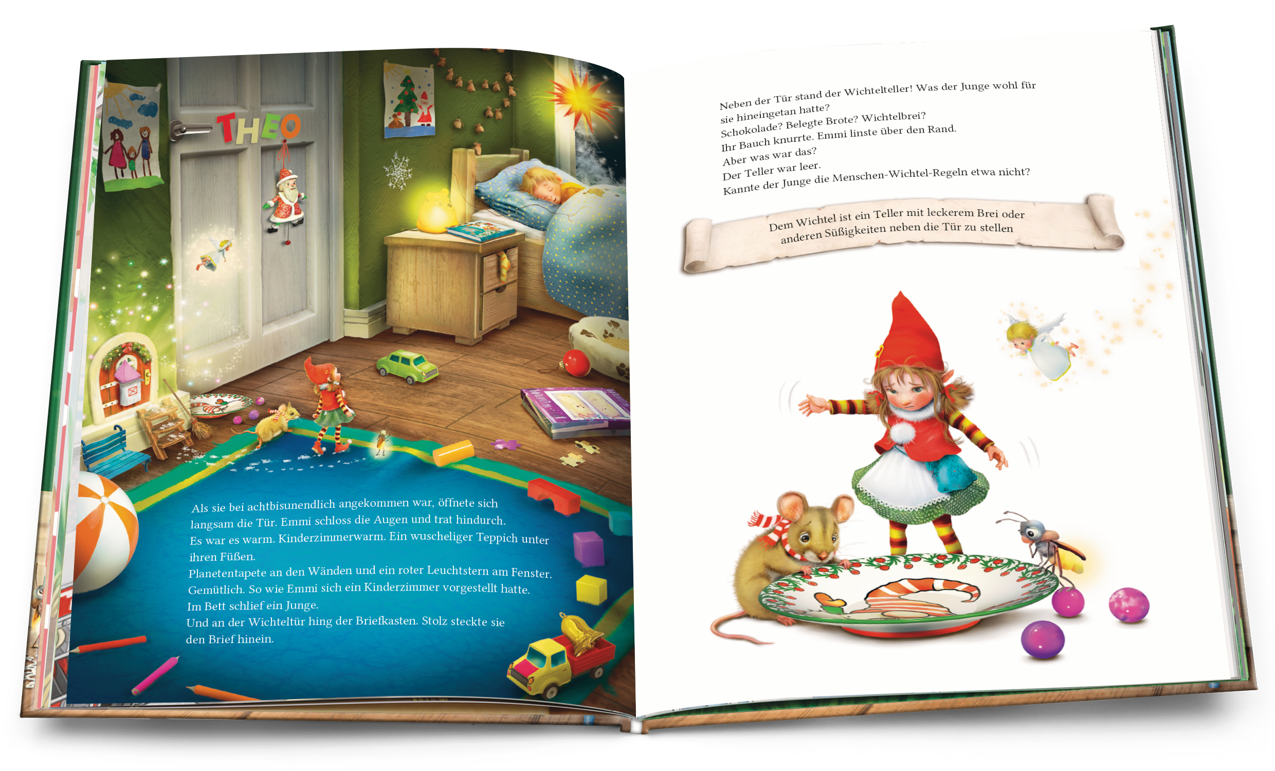 Beherzt tritt das kleine Wichtelmädchen Emmi durch ihre Tür. Aber ach! Theo, der Junge, für den sie wichteln soll, wird wach. Und entdeckt Emmi. Damit hat sie die wichtigste Wichtelregel gebrochen: Niemals von einem Menschen gesehen werden! Sonst darf sie nicht zurück in den Wichtelwald. Und tatsächlich! Vor der Tür hängt jetzt ein dickes Vorhängeschloss. Kann sich Emmi aus dieser misslichen Lage retten? Vielleicht mit Wichtelzauber und Theos Hilfe?