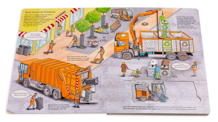 | Schlagworte | Altglascontainer, Altpapier, Sperrmüll • Elektroschrott • Flohmarkt • Mitmachbuch mit Spieleffekten • Müllabfuhr für Kinder • Müllauto, Müllfahrzeug • Mülltonne, Restmüll, Biomüll • Mülltrennung, Abfall trennen • Müllverbrennung • Müllwerkerin, Müllwerker • Nachhaltigkeit für Kinder • Plastik und Müll vermeiden • Räumfahrzeuge, Winterdienst • Straßenreinigung • Umweltbewusstsein für Kinder • Umweltschutz für Kinder • Wertstoffhof, Recycling, Sondermüll • Wiederverwertung |