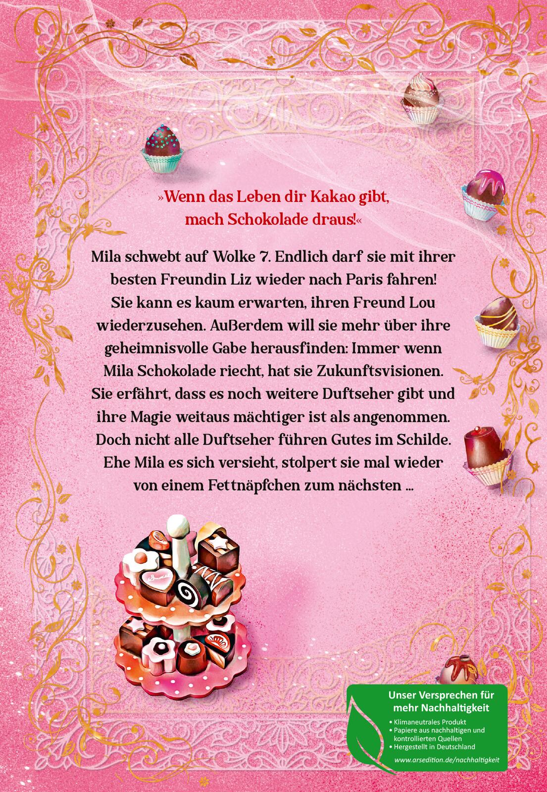 Mila schwebt auf Wolke 7: Endlich darf sie mit ihrer besten Freundin Liz wieder nach Paris fahren! Sie kann es kaum erwarten, ihren Freund Lou wiederzusehen. Außerdem will sie mehr über ihre geheimnisvolle Gabe herausfinden: Immer wenn Mila Schokolade riecht, hat sie Zukunftsvisionen. Sie erfährt, dass es noch weitere Duftseher gibt und ihre Magie weitaus mächtiger ist als angenommen. Doch nicht alle Duftseher führen Gutes im Schilde. Ehe Mila es sich versieht, stolpert sie mal wieder von einem Fettnäpfchen zum nächsten ...