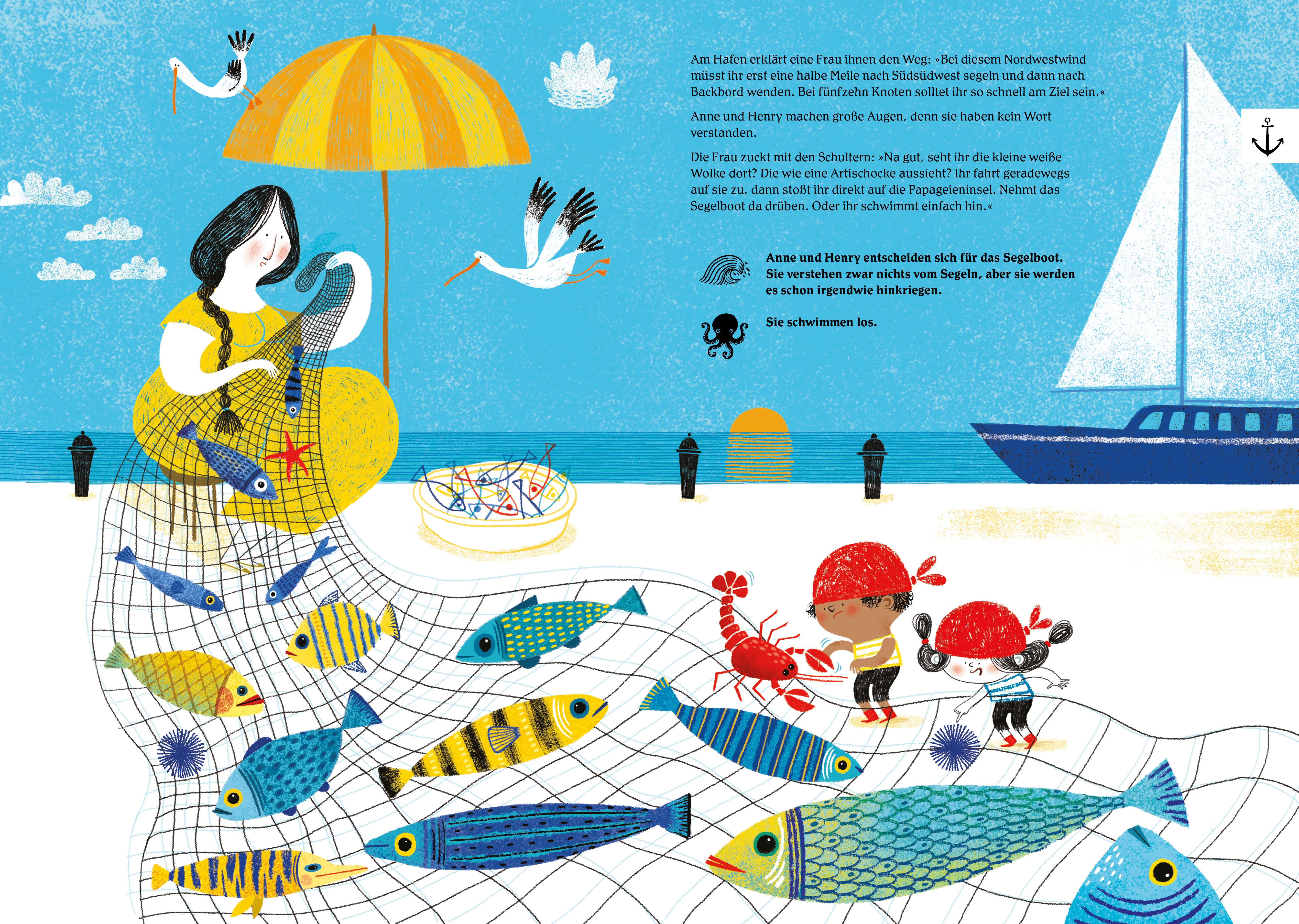 Hier dürfen die Kinder selbst über das Abenteuer entscheiden: Das U-Boot nehmen oder dem Wal den Bauch kitzeln? Alles ist möglich. Auf jeder Seite muss aus zwei Möglichkeiten gewählt werden, welchen Verlauf die Geschichte nehmen soll.