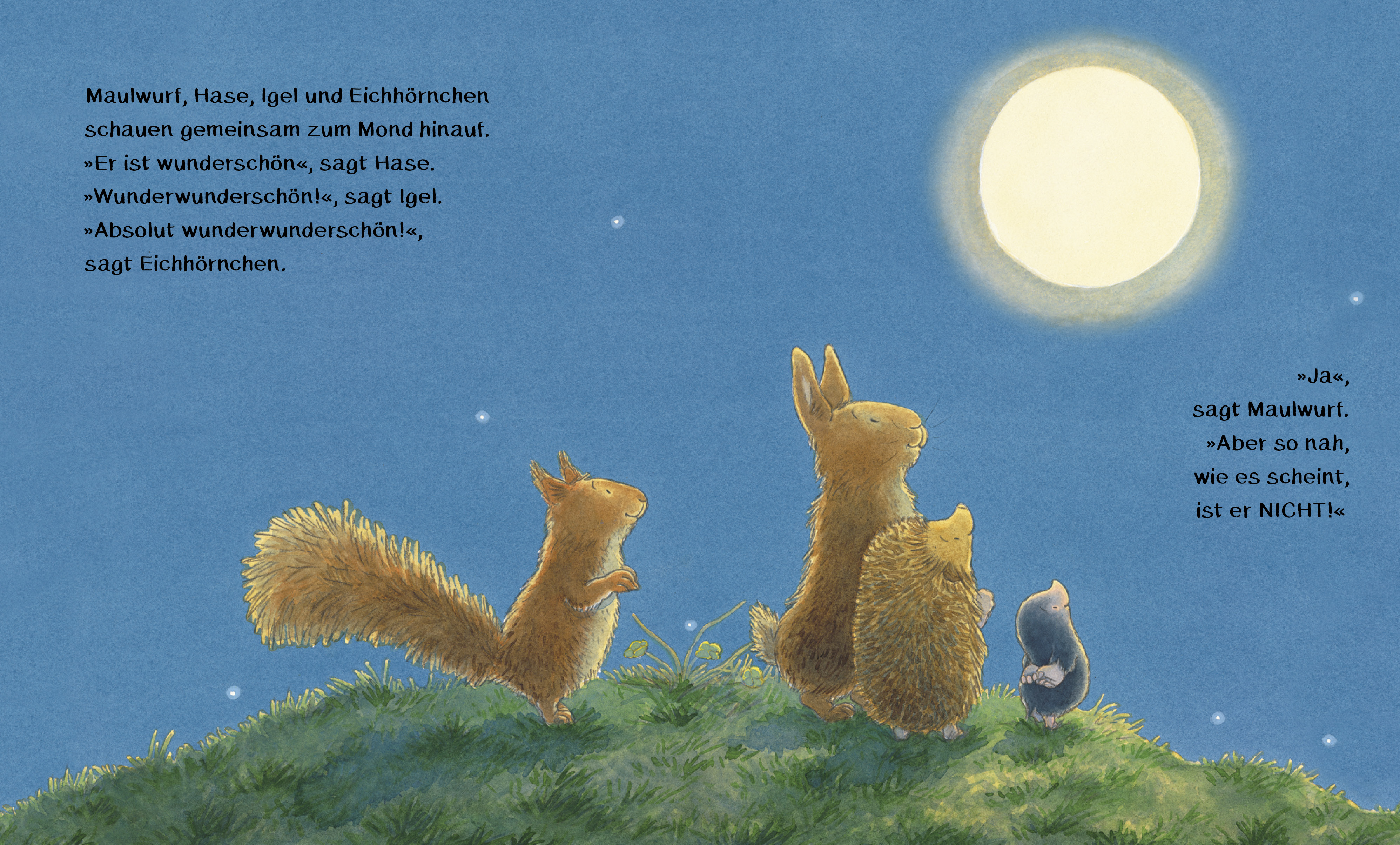 Eines Nachts entdeckt der Maulwurf den Mond. »Was auch immer das ist - ich muss es haben«, denkt er und versucht alles, um den Mond vom Himmel zu holen. Nachdem er sogar auf einen Baum geklettert ist und herunterfällt, entdeckt er den Mond in einer Pfütze - doch als er ihn aufheben will, zerbricht er. Maulwurf ist verzweifelt und weint, weil er den Mond kaputtgemacht hat. Doch seine Freunde zeigen ihm, dass der Mond immer noch am Himmel hängt, und erklären, dass man ihn nicht herunterholen kann - nur aus der Ferne bewundern.