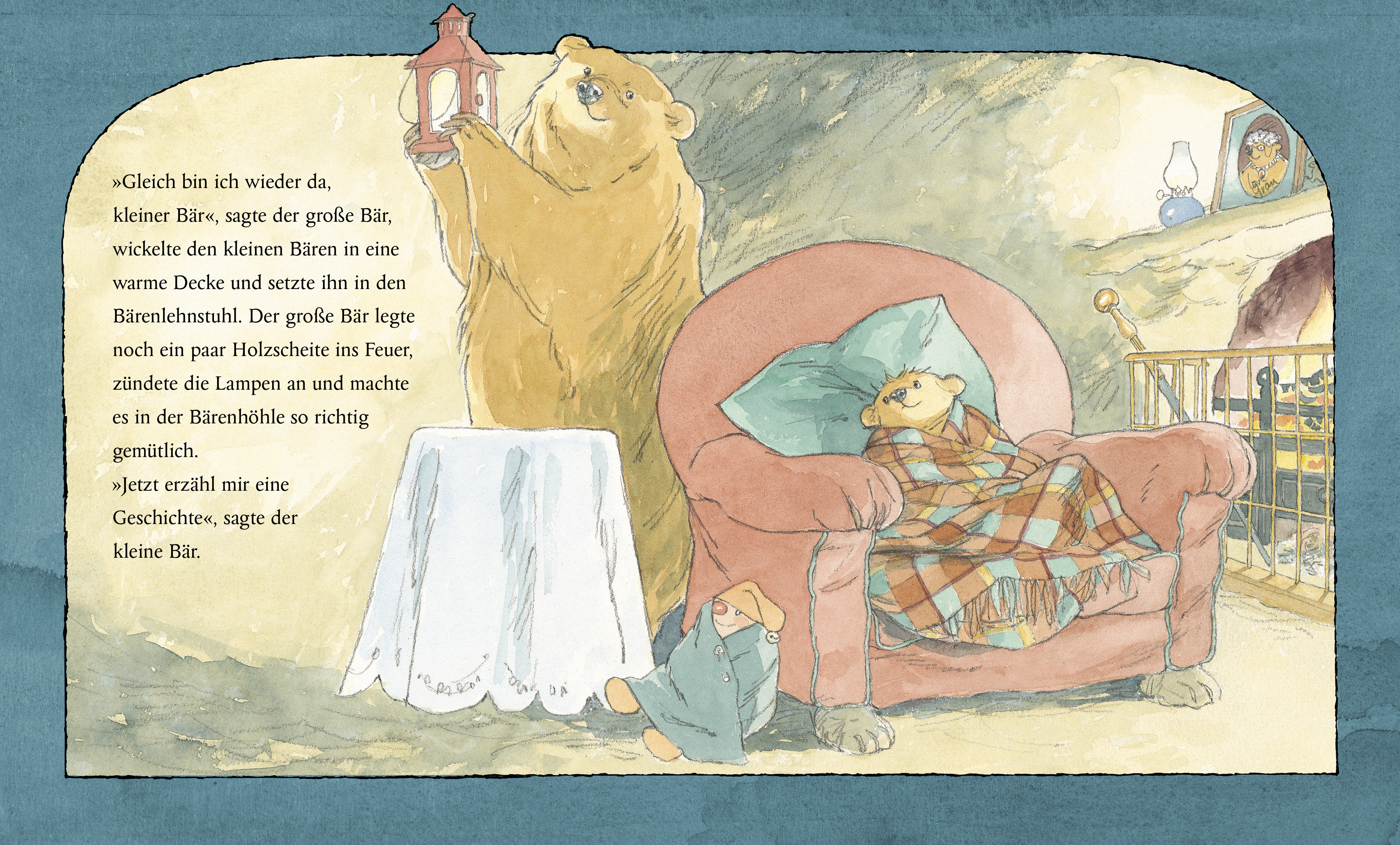 Der kleine Bär und der große Bär marschieren durch den Wald. Doch was sind das für unheimliche Geräusche um sie herum? Es braust und knackst. Und der Weg zur Bärenhöhle ist noch weit. Da nimmt der große Bär den kleinen Bären auf die Schultern. Denn zu Hause wartet ja noch eine Gutenachtgeschichte!
