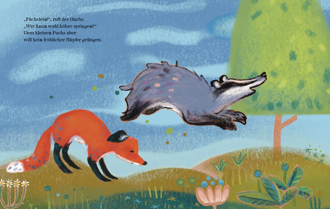 "Füchslein, wer kann wohl höher springen?", fragt der Dachs. Aber dem Fuchs mag kein fröhlicher Hüpfer gelingen. Schnell kommt ihm der Hirsch zu Hilfe und bringt ihn nach Hause zu Mama Fuchs. Dem Füchslein geht es nicht gut. Mama Fuchs pfl egt ihn mit kühlenden Tautropfen, frischen Kräutern und einem Bett aus Moos. So wohlig behütet erlebt der kleine Fuchs das Kranksein und Gesundwerden.