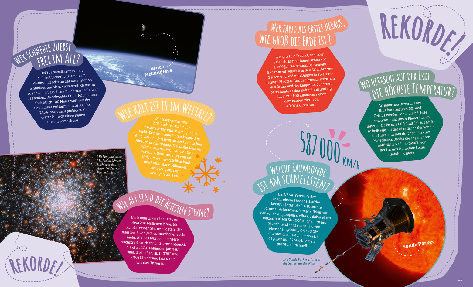 Ist das Universum wirklich mit einem Urknall entstanden? Und wenn ja: Was war davor? Wie viele Sterne hat unsere Milchstraße und können wir dort hinfliegen? Gibt es irgendwo da draußen Außerirdische? Wie wird man Astronautin oder Astronaut? Was sind Schwarze Löcher? Und warum ist Pluto eigentlich kein Planet mehr? Die Kinder gehen auf eine spannende Reise durch den Weltraum. Einige Himmelskörper kann man mit bloßem Auge erkennen, andere werden mühsam erforscht. Und weil alles ganz einfach verständlich erklärt wird, wimmelt es in diesem Buch nicht nur von Sternen, Planeten und Monden, sondern auch von Luftballons, Bauklötzen, Wasserpistolen und anderen Alltagsgegenständen. Ob das Universum unendlich groß ist, weiß niemand. Aber es ist unendlich spannend!