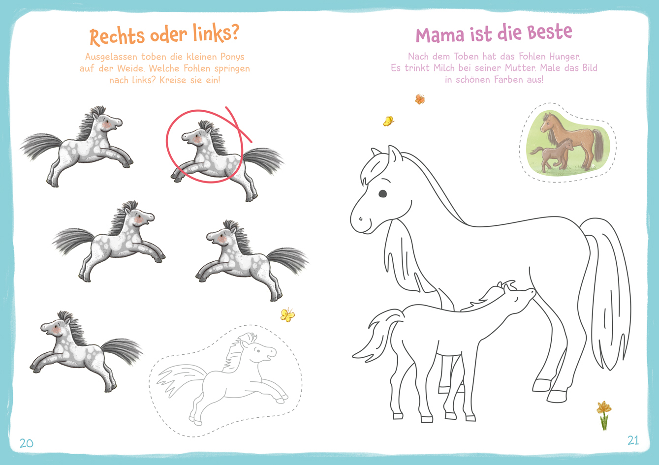 Ganz viel abwechslungsreiche Beschäftigung mit den Lieblingstieren der Kinder: 20 verschiedene Rätsel und Ausmalbilder mit Ponys bieten eine tolle Unterhaltung - zuhause und unterwegs. Wie finden die Ponys den Weg zu den Leckerlis? In welcher Reihenfolge wird der Stall ausgemistet? Welcher Schatten gehört zur Reiterin? Einige Rätsel werden mit fröhlichen Stickern gelöst oder Ausmalbilder können nach Belieben bunt gestaltet werden. Diese und viele weitere spannende Rätsel nehmen die Kinder ab 3 Jahren mit auf den Ponyhof.