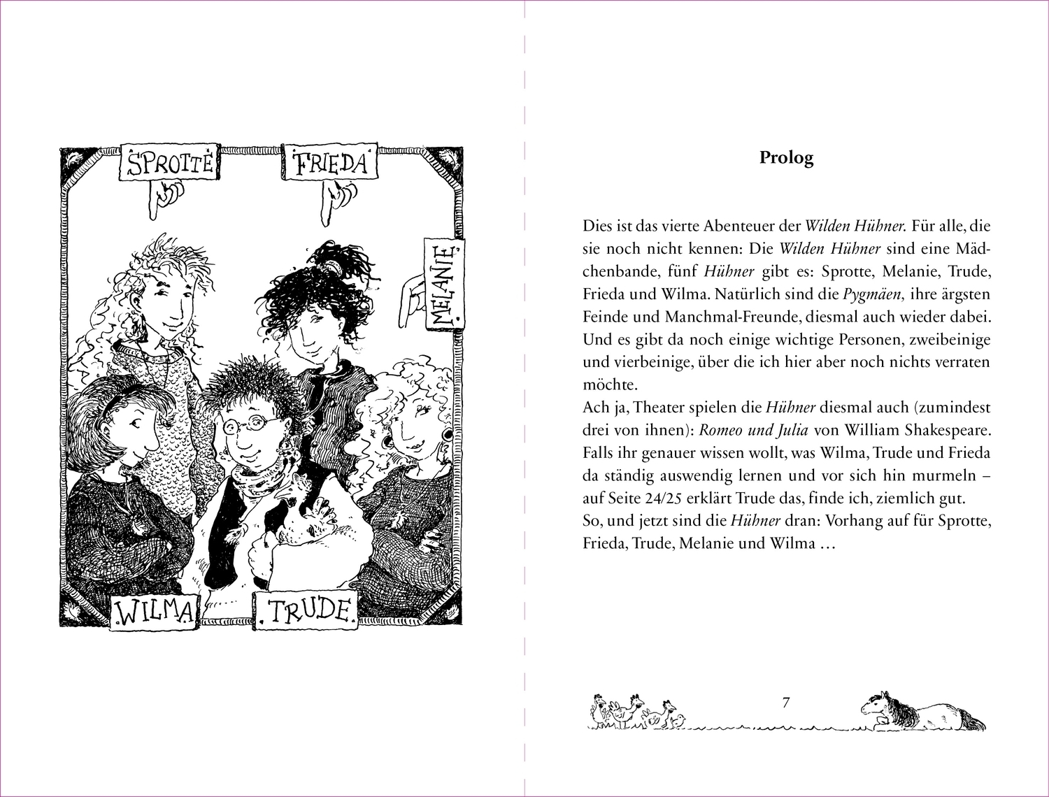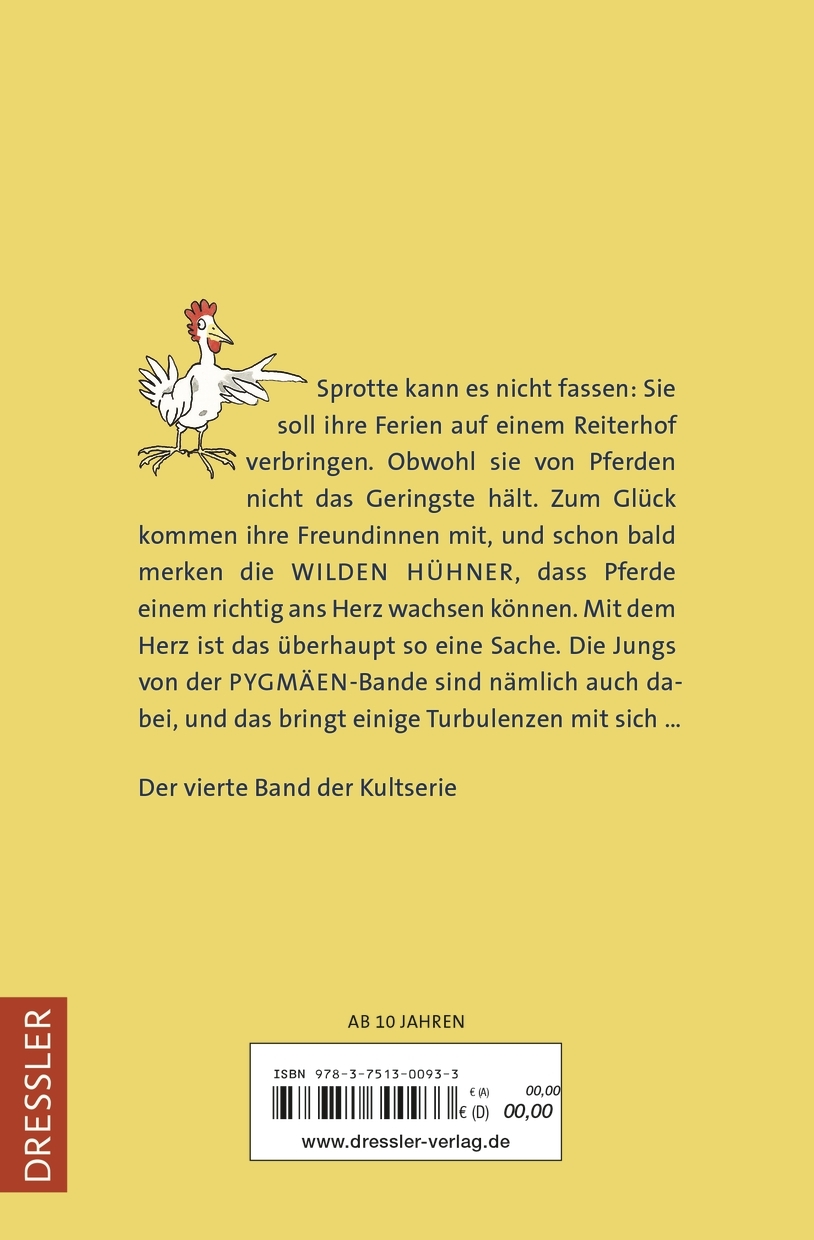 Darf ein Huhn einen Pygmäen küssen? Sprotte kann es nicht fassen: Sie soll ihre Ferien auf einem Reiterhof verbringen. Obwohl sie von Pferden nicht das Geringste hält. Zum Glück kommen wenigstens auch alle anderen WILDEN HÜHNER mit und bald merken die fünf Freundinnen, dass an dem Spruch vom "höchsten Glück der Erde" etwas dran ist. Wer hätte gedacht, dass man sich beim Reiten so wunderbar leicht fühlt, fast schwindelig, und einem die Pferde so ans Herz wachsen können. Mit dem Herz ist das überhaupt so eine Sache. Die Jungs von der PYGMÄEN-Bande sind nämlich auch mit von der Partie und das hat zur Folge, dass Melanie Sehnsucht nach Willi hat und Theorien übers Küssen verbreitet. Wilma, Frieda und Trude proben "Romeo und Julia" im Pferdestall - und dann verliebt sich Frieda auch noch. Das kann Sprotte natürlich nicht passieren, glaubt sie jedenfalls ...
