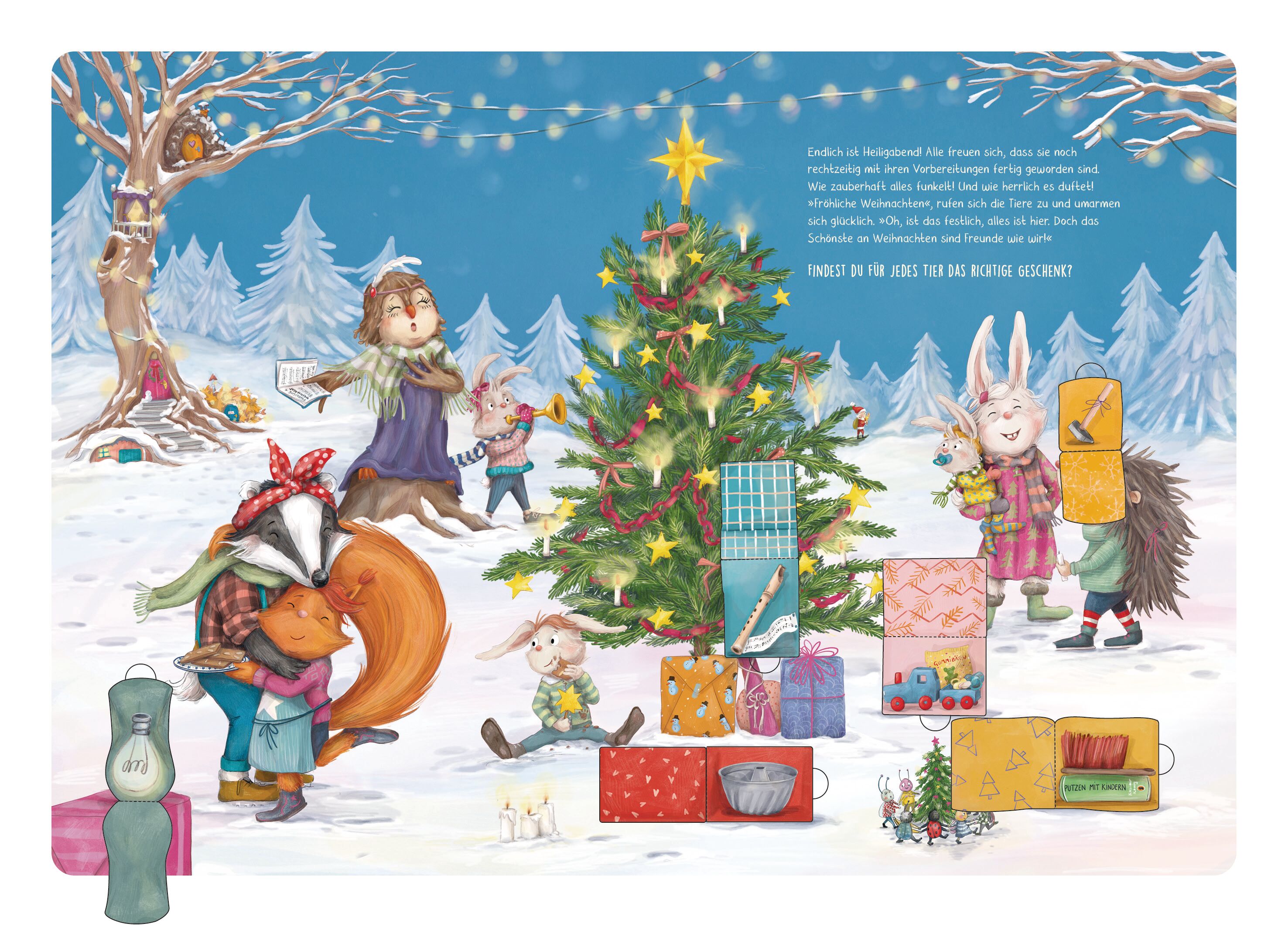 Doch wo sind all die Sachen, die man dafür benötigt? Die Kinder werden in lustigen Reimen dazu animiert, die fehlenden Dinge zu suchen, sodass die Tiere zum Schluss doch noch ein richtig schönes Weihnachtsfest miteinander feiern können!Pappbilderbuch im extragroßen Format mit vielen Klappen und wimmeligen Bildern für Kinder ab 2 Jahren- Ideal für das Warten auf Weihnachten