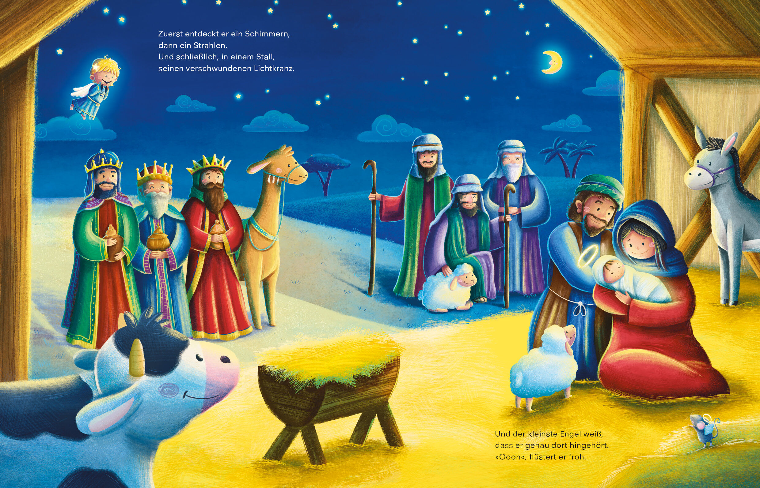 Der kleinste Engel von allen will unbedingt alles so machen wie die großen Engel hoch oben im Himmel: singen, Sterne formen oder auch wichtige Botschaften überbringen. Doch immer geht etwas schief! Einmal verliert der kleinste Engel sogar seinen Lichtkranz! Der fällt und fällt und fällt - bis hinunter zur Erde. Und in einem Stall, bei einem kleinen Kind in einer Krippe, erwartet den kleinsten Engel von allen nun das allergrößte Weihnachtswunder. Eine ganz besondere Bilderbuchgeschichte über einen tollpatschigen kleinen Engel mit besonderem Extra: In den Bildern wird ganz nebenbei die klassische Weihnachtsgeschichte erzählt.