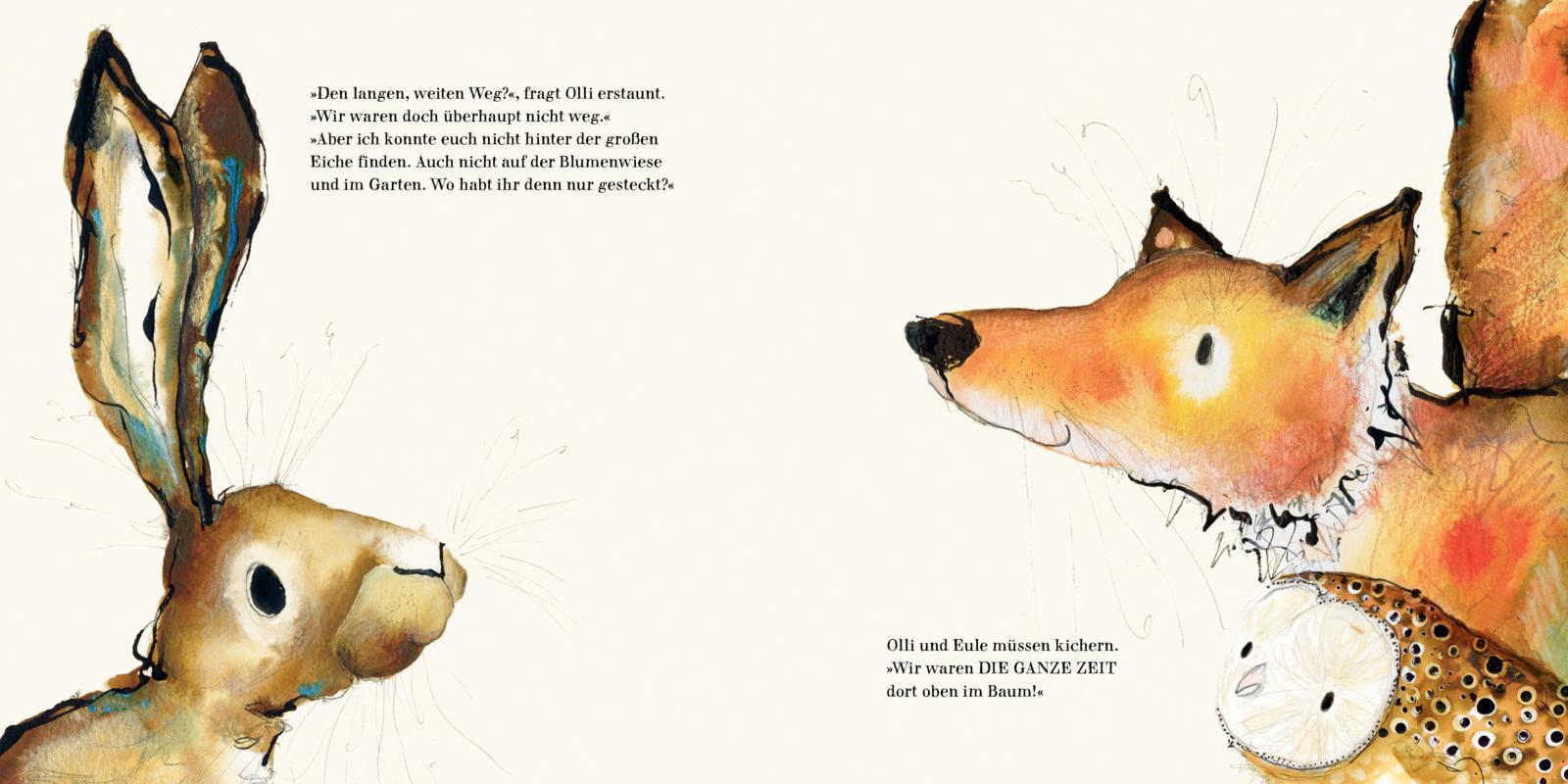 Molly, das kleine Hasenmädchen, Olli, der Fuchs, und Eule wohnen gleich hinter der dicken Eiche. Sie lieben es, dort Verstecken zu spielen. Doch dann verstecken Olli und Eule sich zu gut. Auf der Blumenwiese, hinter der Gartenmauer oder neben dem Holzstapel: Molly kann ihre Freunde nicht mehr finden und bekommt es mit der Angst zu tun. Was, wenn Olli und Eule sie alleine gelassen haben? Da raschelt es plötzlich in der Baumkrone über ihr ...