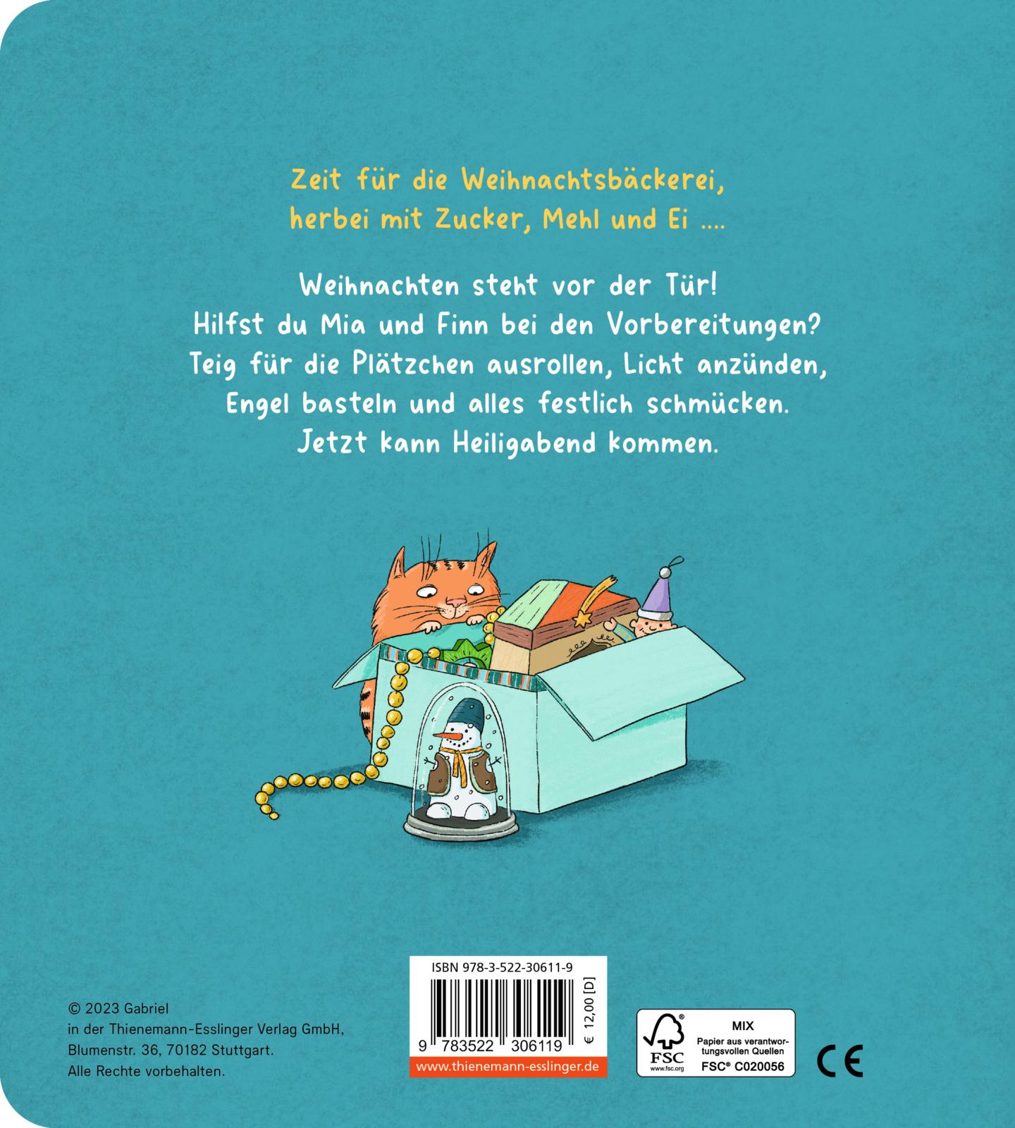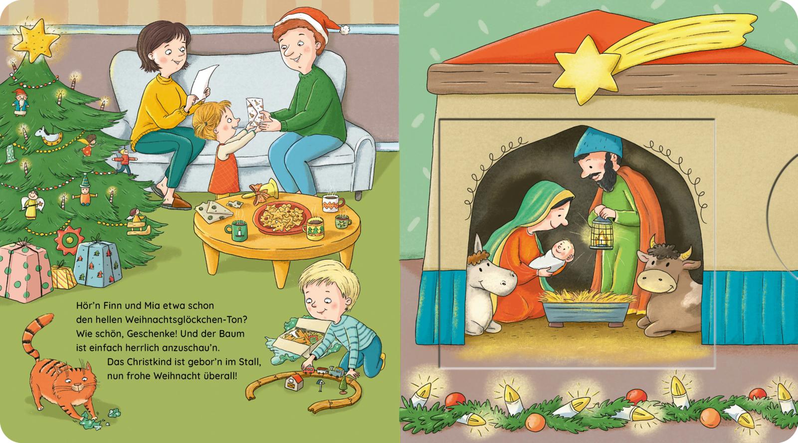 Wenn es draußen nach winter duftet und das Licht am Adventskranz warm leuchtet, begleiten Kinder Mia und Finn durch die schönste Zeit des Jahres: In der Weihnachtsbäckerei wird Teig gerollt und Förmchen gedrückt, im Kindergartenstil werden liebevolle Geschenke mit Oma gebastelt, und am strahlenden Weihnachtsbaum beginnt endlich das Fest in der Familie. Dank robuster Pappseiten und kinderleichter Spielelemente können kleine Hände aktiv mitmachen - vom Stern anknipsen bis zum Öffnen der Krippe mit Maria, Josef und dem Jesuskind. So entsteht ein stimmungsvolles Vorleseerlebnis, das Geborgenheit schenkt, den Wortschatz erweitert und die Vorfreude auf das Weihnachtsfest in der Familie stärkt. Perfekt als Geschenk im Advent und für alle, die gemeinsam Kekse backen und die Magie von Licht und Geschenken teilen möchten.