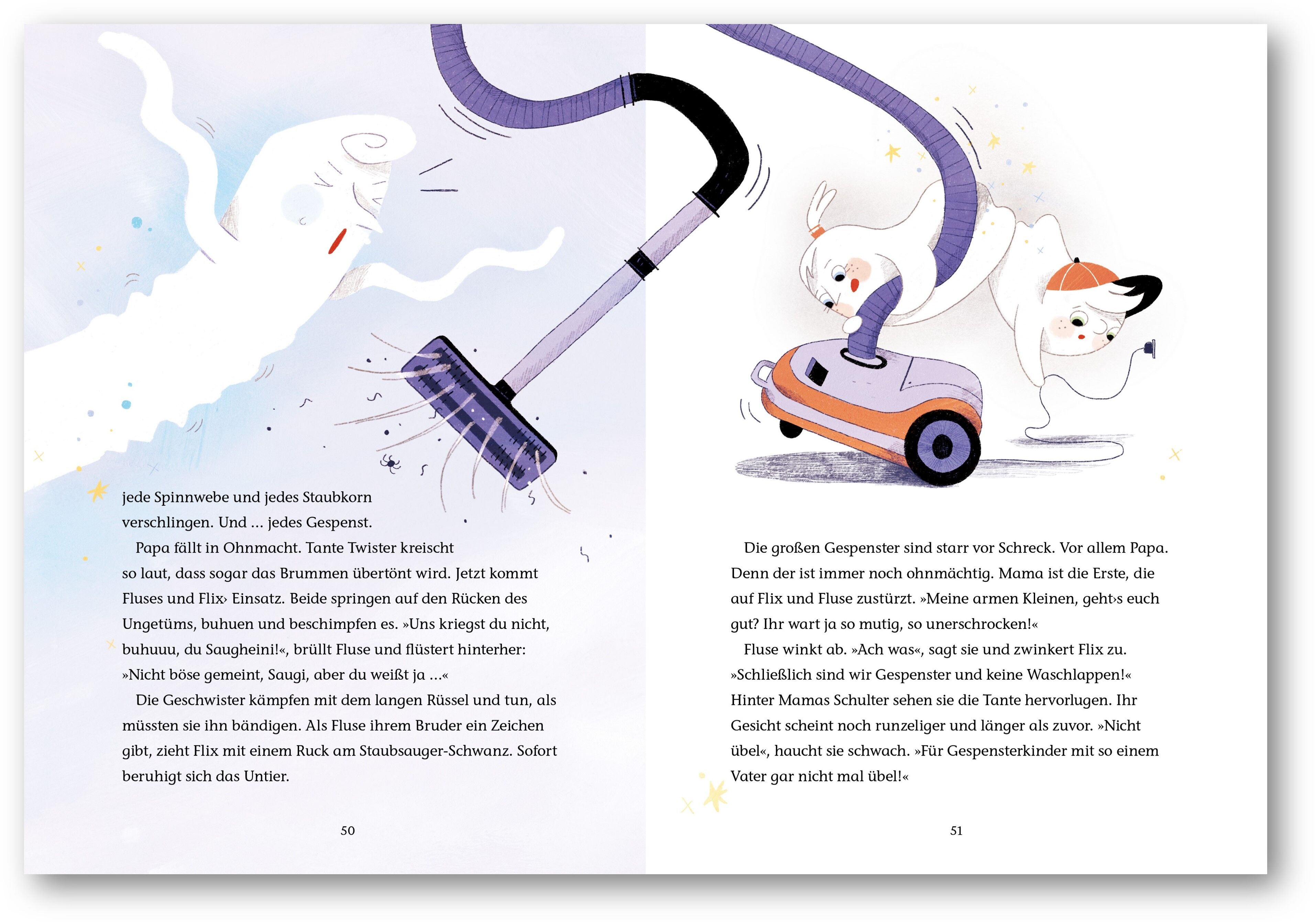 Die kleinen Gespenster Flitz und Fluse sind beunruhigt: Tante Twister, die nicht nur sehr gemein, sondern auch furchtbar altmodisch ist, möchte die Geschwister in »Spukerei« prüfen. Was macht man da, wenn man Spuken nicht nur langweilig, sondern richtig gefährlich findet? Bestehen Flitz und Fluse die Prüfung nicht, wird Tante Twister sie den Sommer über zu sich nehmen, um sie zu »richtigen Gespenstern« zu machen. Wie gut, dass sie kurz zuvor ein Ungeheuer auf dem Dachboden entdeckt haben, das für all das steht, was Gespenster fürchten: Ordnung, Sauberkeit und extrastarke Saugkraft! Kann das Ungeheuer dabei helfen, die fiese Tante wieder zu vertreiben?