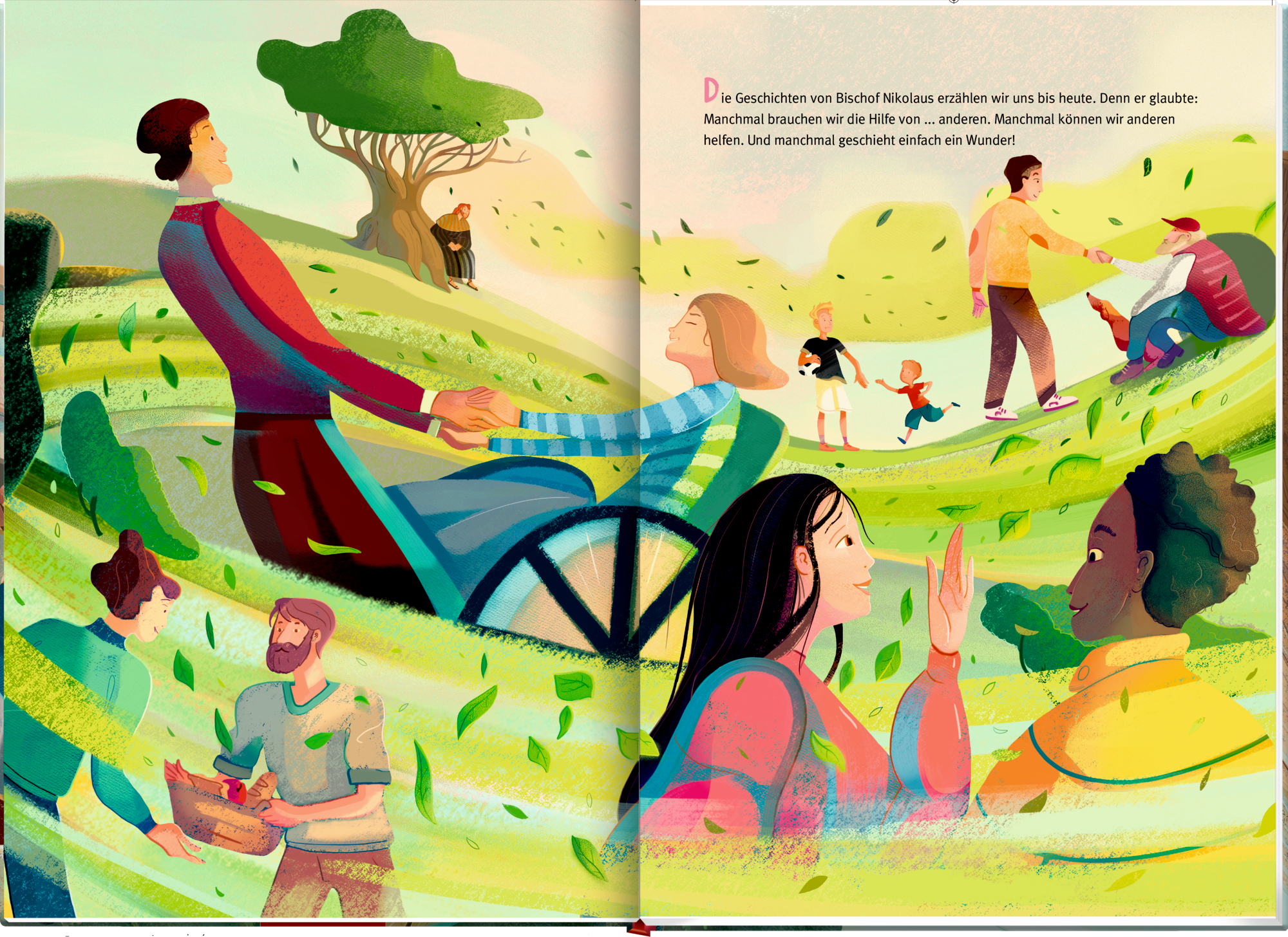Gott schuf die Welt, Büsche, Bäume, Blumen und Tiere. Und die Menschen. Gott wollte, dass sie einander lieb hatten. Dass sie sich gegenseitig halfen und beschützten. Davon erzählten sich die Menschen. Die Großeltern erzählten es den Eltern. Die Eltern erzählten es den Kindern. Eines dieser Kinder hieß Nikolaus. Er wollte die Welt zu einem besseren Ort machen ...