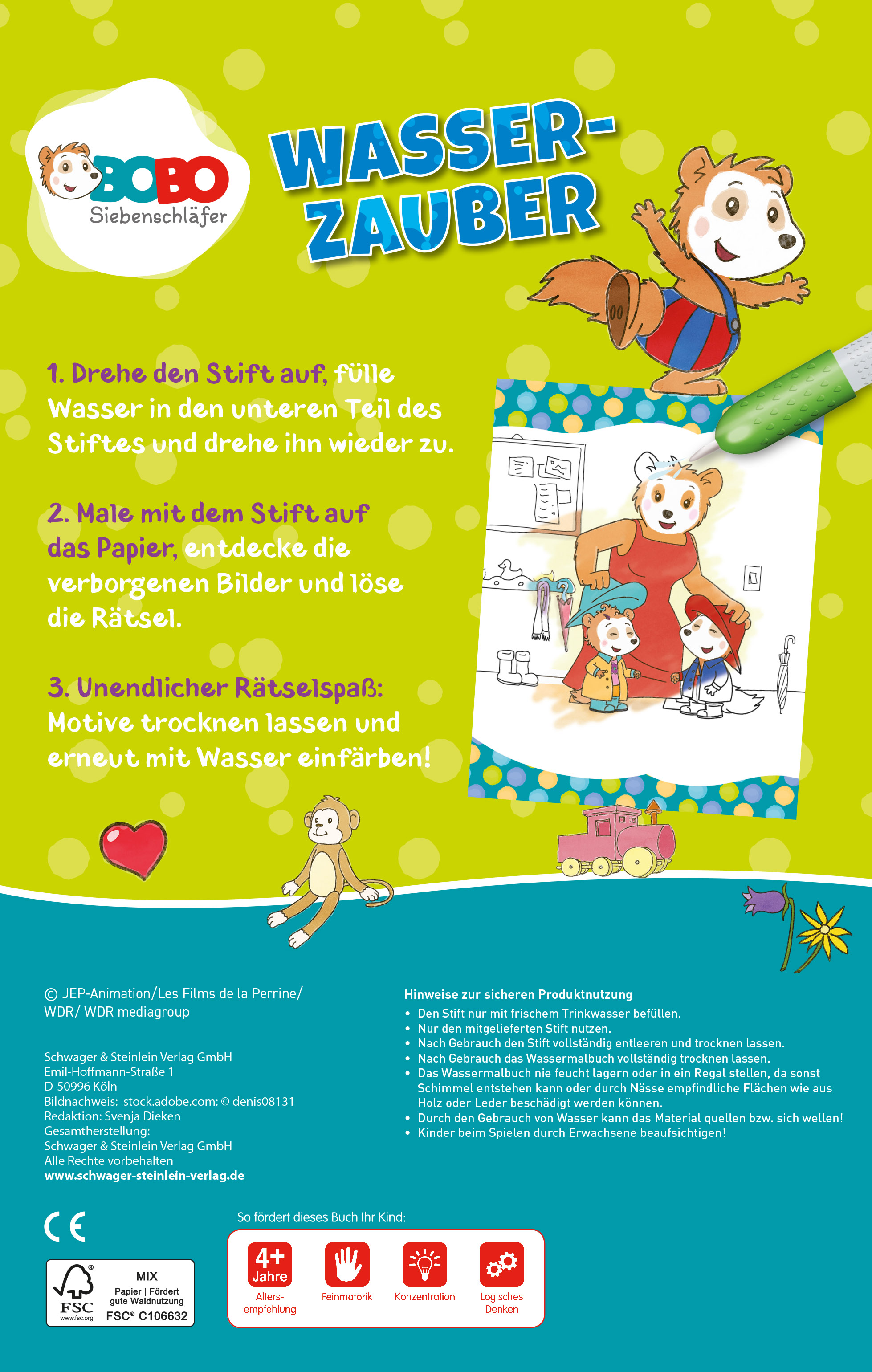 Mit dem Wassermalspaß von Bobo Siebenschläfer erweckt man tolle Bilder von Bobo und seinen Freunden zum Leben! Einfach den Stift mit Wasser befüllen, über die Seiten malen und plötzlich erscheinen die kunterbunten Figuren aus der beliebten Serie in Farbe!