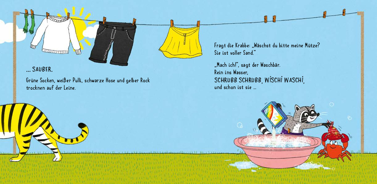 Nichts tut Waschbär lieber, als Schmutziges wieder sauber zu waschen. Schrubb schrubb, wischi waschi. Der Frosch bringt seine grünen Socken, der Tiger seinen gelben Rock, das Schaf den weißen Pulli. Schrubb schrubb, wischi waschi. Immer länger wird die Leine, an der alles zum Trocknen in der Sonne hängt. Die vielen kleinen Fans von Susanne Straßers Bilderbüchern wissen es längst: So beschaulich bleibt es nicht. Und richtig, als der Waschbär die Kleider verteilt, geht es lustig drunter und drüber! Und damit nicht genug: Am Himmel hat sich mächtig was zusammengebraut...