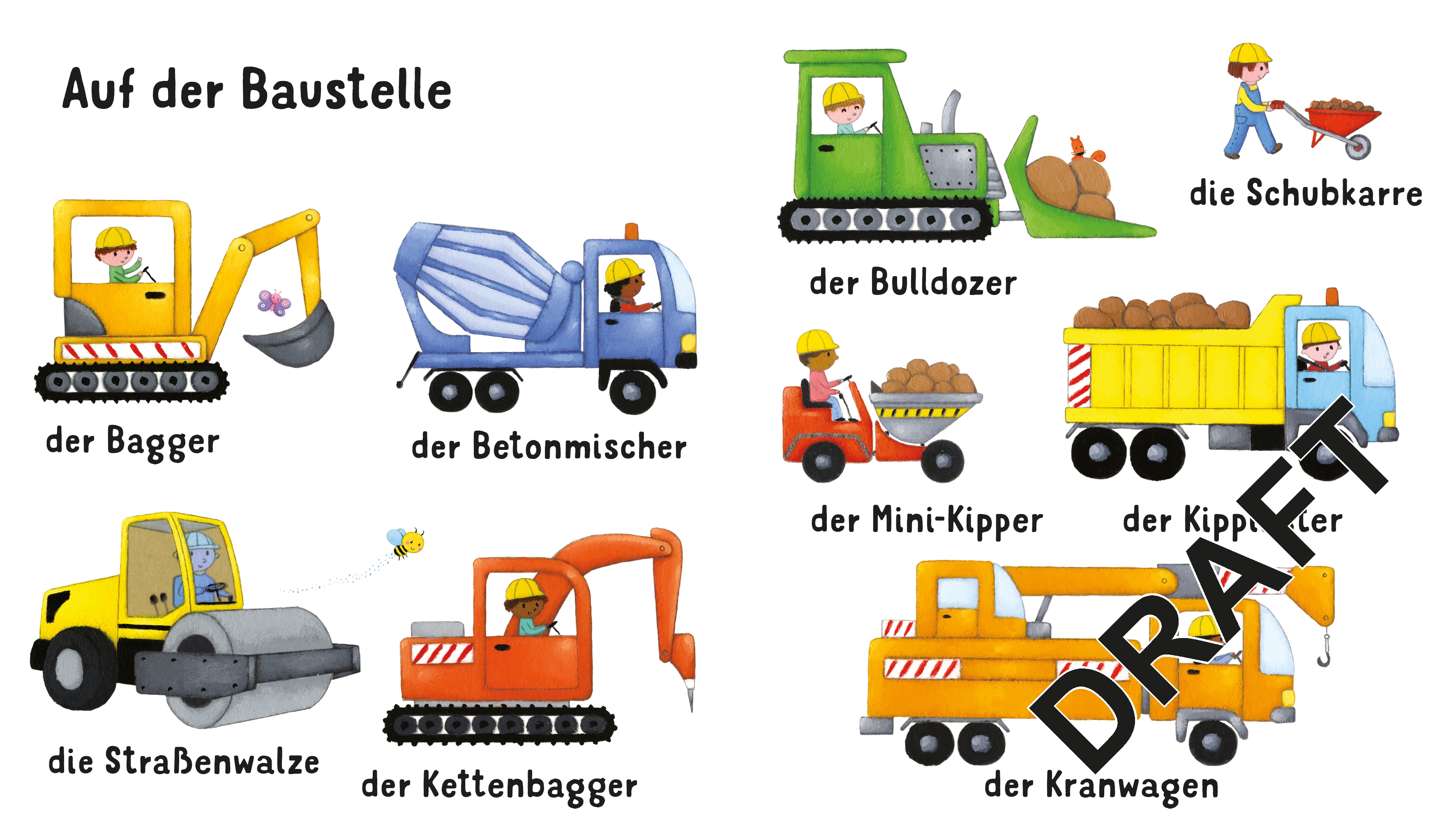Auto, Bagger, Roller – dieses bunte Bildwörterbuch enthält viele Fahrzeuge aus der alltäglichen Lebenswelt zum Entdecken und Benennen. Ob auf der Straße, auf der Baustelle oder in der Luft – Wort für Wort erkunden kleine Kinder ihre Welt.