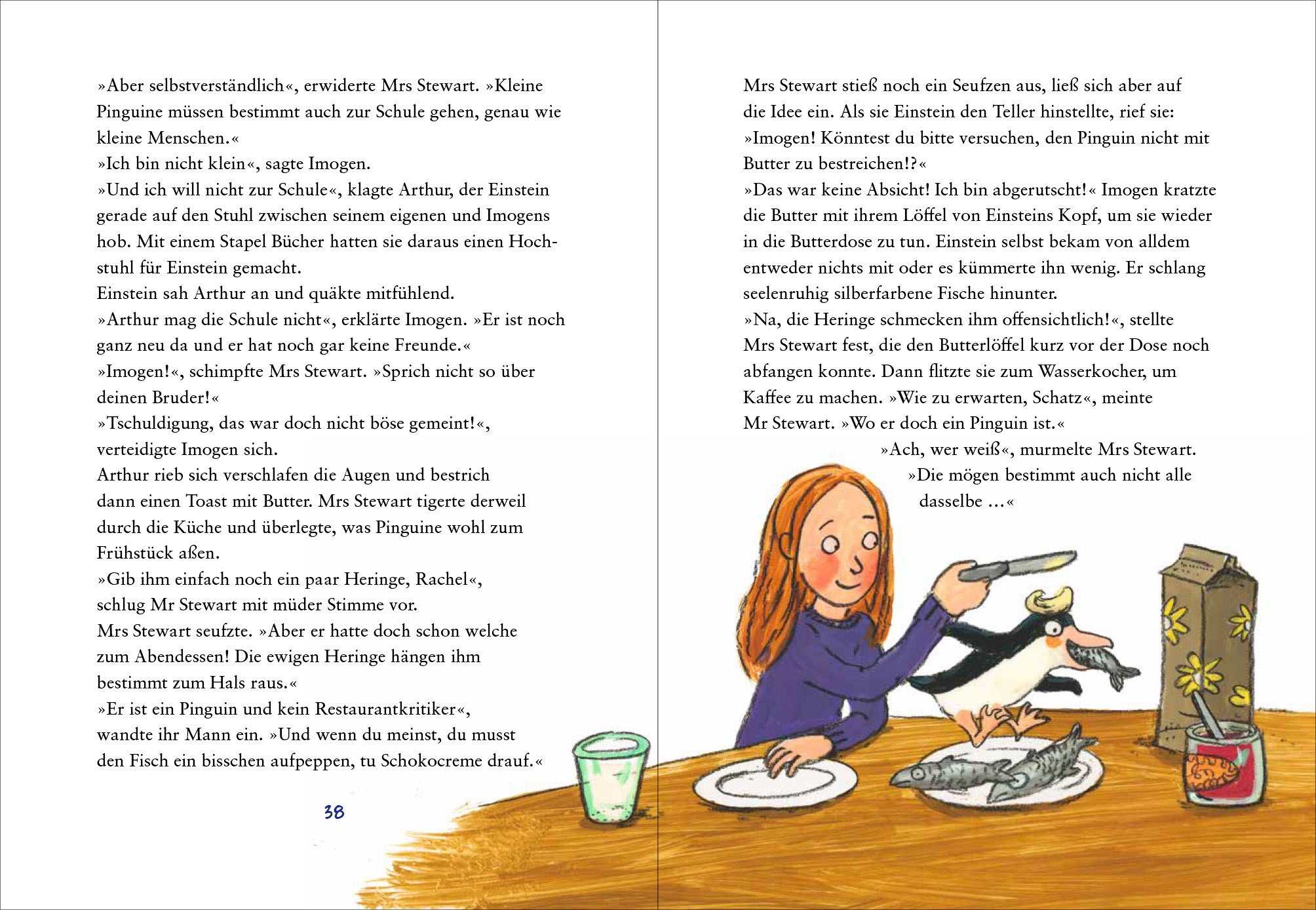 Gerade eben hat Familie Stewart den kleinen Pinguin noch im Zoo gesehen und nun steht er vor ihrer Tür. Imogen und Arthur sind begeistert, ihre Eltern sind es weniger. Aber man kann einen kleinen Pinguin natürlich nicht draußen in der Kälte stehen lassen, deshalb bitten sie ihn zum Abendessen herein. Wie sich herausstellt, mögen auch Pinguine Lasagne, wobei ihre Tischmanieren einiges zu wünschen übrig lassen.