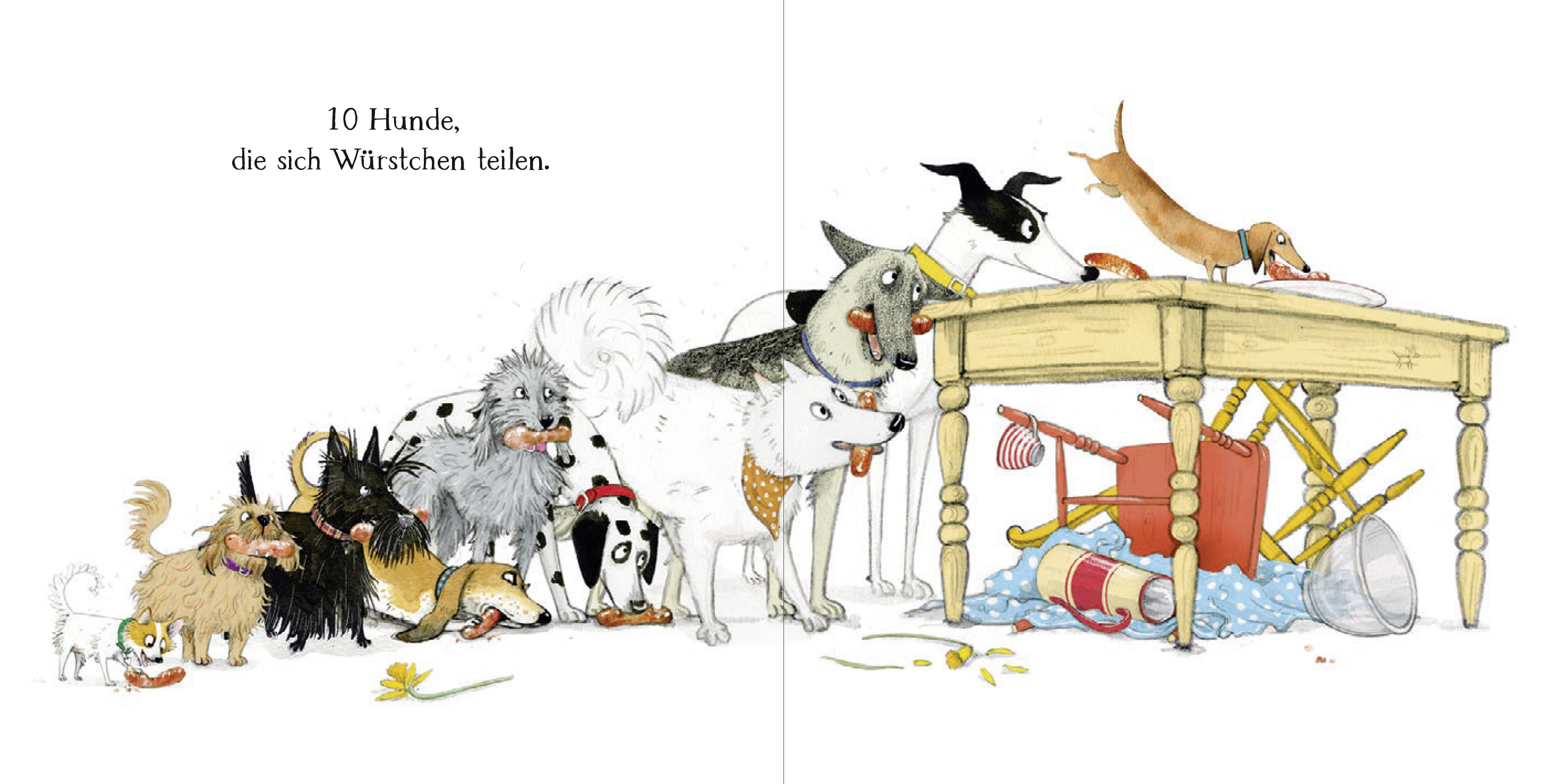 10 Hunde haben Hunger. Es gibt zehn Würstchen. Bekommt ein Hund alle Würstchen? Oder zwei Hunde jeweils fünf? Oder fünf Hunde jeder zwei? Und wenn sechs Hunde mit den Würstchen spielen? Wieviele Hunde schauen dann dabei zu? Gehen die anderen leer aus, wenn acht Hunde sich zehn Würstchen teilen? Wie teilt man gerecht? Diese bunte Hundeschar spielt alle Möglichkeiten durch und kommt am Schluss doch zu einem ganz einfachen Rechenergebnis. Jeder bekommt eins.