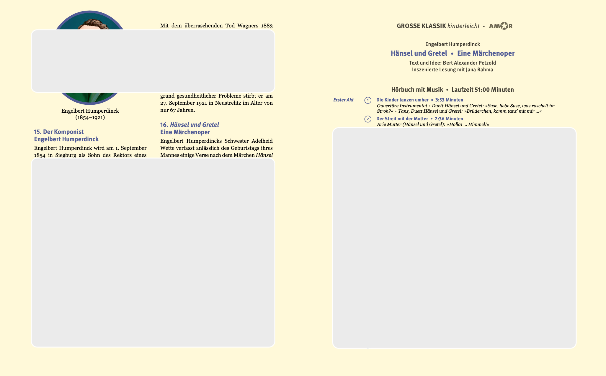 | Schlagworte | Adelheid Wette, geb. Humperdinck • Adelheid Wette, geborene Humperdinck • Amor Verlag Leipzig • Antje Hamer • Basiswissen • bekannte Lieder • Bert Alexander Petzold • Brüder Grimm • Bücherwege • Der Ring des Nibelungen für kleine Horer • Der Ring des Nibelungen für kleine Hörer • Deutsches Nationaltheater Weimar Jubiläum Uraufführung 23. Dezember 1893 23.12.1893 • Deutsches Theater Mendelssohn-Preis Opernkomponist Märchenoper • Download • Eine Märchenoper • Ein Männlein steht im Walde • Engelbert Humperdinck • Franz Xaver Hartmann • Gebunden • Gertrud Helene Olivia Humperdinck • Geschwister Eltern Kinder • Gretel • Große Klassik kinderleicht • Große Oper für kleine Horer • Große Oper für kleine Hörer • Gustav Ferdinand Humperdinck • Hänsel • Hänsel und Gretel • Hardcover • Hörbuch • Hörspiel • Illustrationen • Inszenierte Lesung • Jana Rahma • Kinderbuch Hörspiel mit Musik Hörbuch mit Musik • Kinder Schüler Lehrer Schule Bildung • Klassik für Kinder • Kultur für Kinder • Kurt Weill Friedrich Hollaender Max Reinhardt • Leinenbezug mit Prägung • Leipzig Venedig • Lesung • Lesung mit Musik • Libretto • Lieder Orchesterwerk Oper Gesang • Lied Oper Klassik Volkslied • Marchen-Klassik für kleine Horer • Märchen-Klassik für kleine Hörer • Märchen Literatur Gedicht • Musik • Ofen Gefahr Familie Glück • Oper für Kinder • Richard Wagner Ferdinand Hiller Richard Strauss • Sandmann Heimweg Brotkrumen • Siegburg Neustrelitz Boppard Darmstadt-Eberstadt Bayreuth • Streaming • Suse, liebe Suse, was raschelt im Stroh • vierfarbig illustriert • Wald • Wald Tiere Vögel Hexe Pfefferkuchenhaus • ZEIT-Edition Die Zeit Wochenzeitung Hamburg |