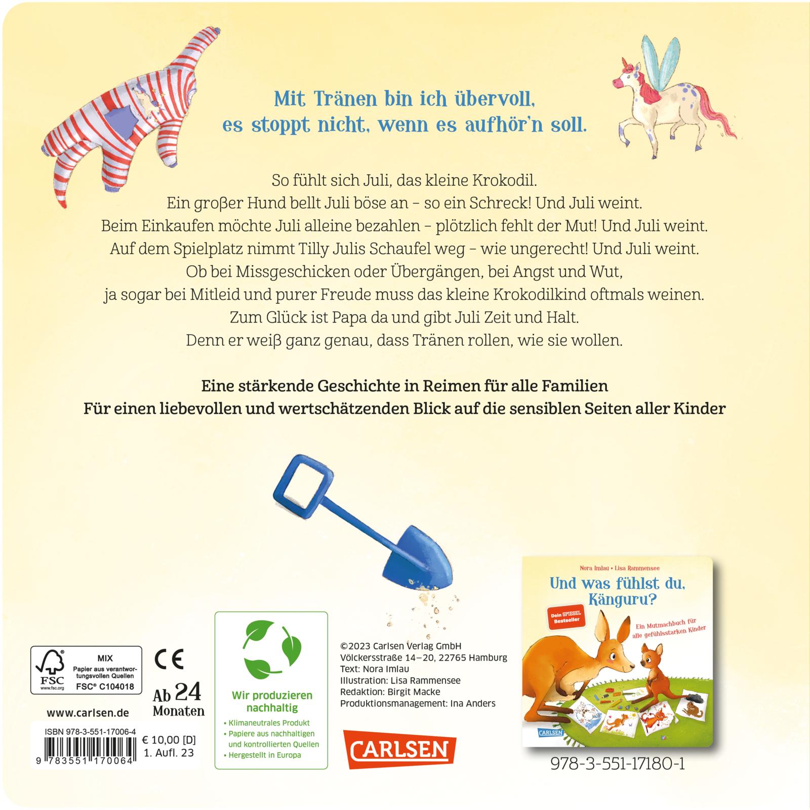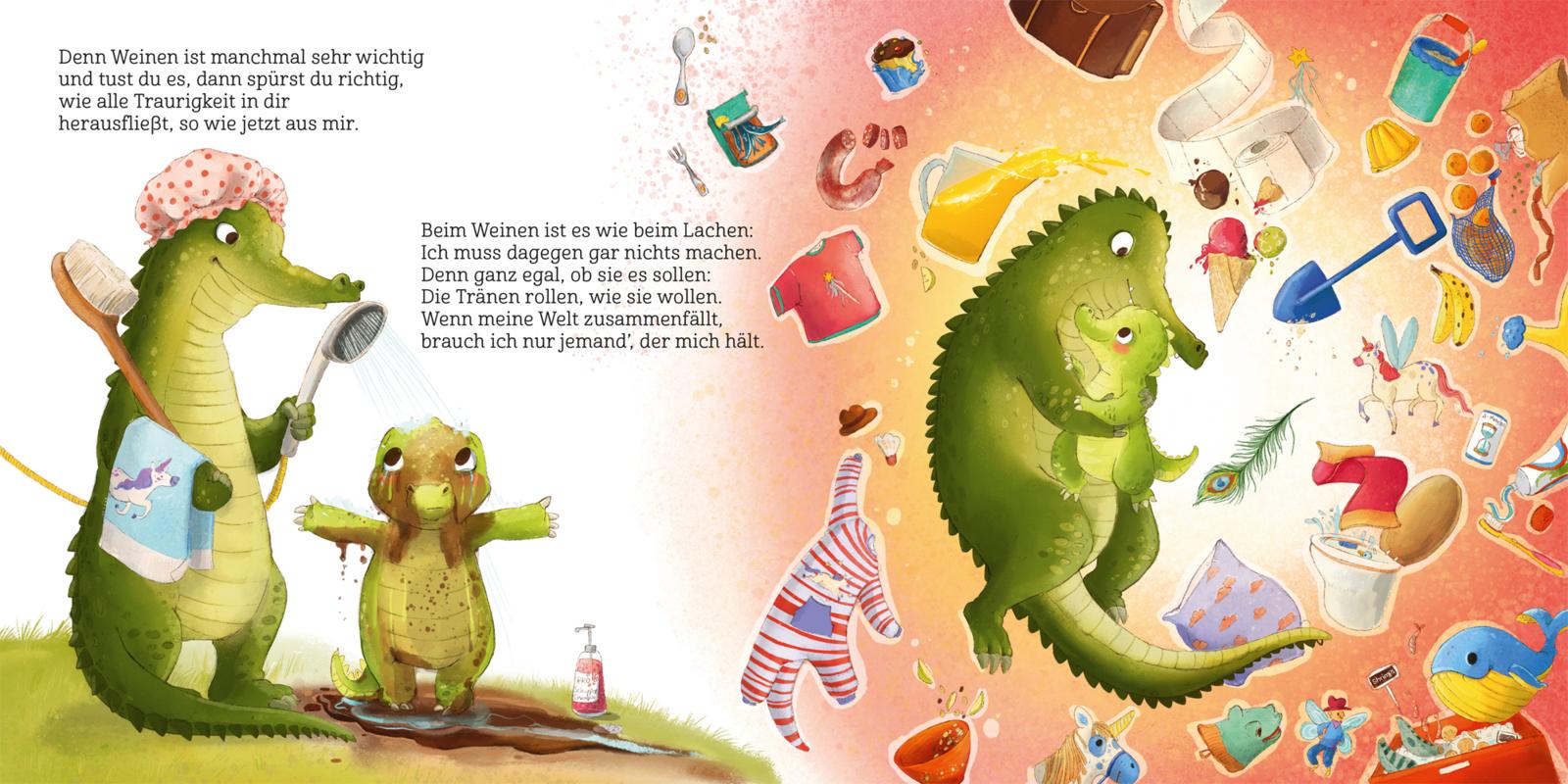 Ob bei Missgeschicken oder Übergängen, bei Angst und Wut, ja sogar bei Mitleid und purer Freude muss das kleine Krokodilkind oftmals weinen. Zum Glück ist Papa da und gibt Juli Zeit, Raum und Halt. Denn er weiß ganz genau, dass Tränen rollen, wie sie wollen und das kleine Krokodil ein Kuschelnest braucht, damit die Tränen mit der Zeit weniger werden können. Das Weinen ist für ein so wunderbar empfindsames Kind wie Juli ein wichtiges Ventil, um sein Erlebtes und Gefühltes zu verarbeiten.