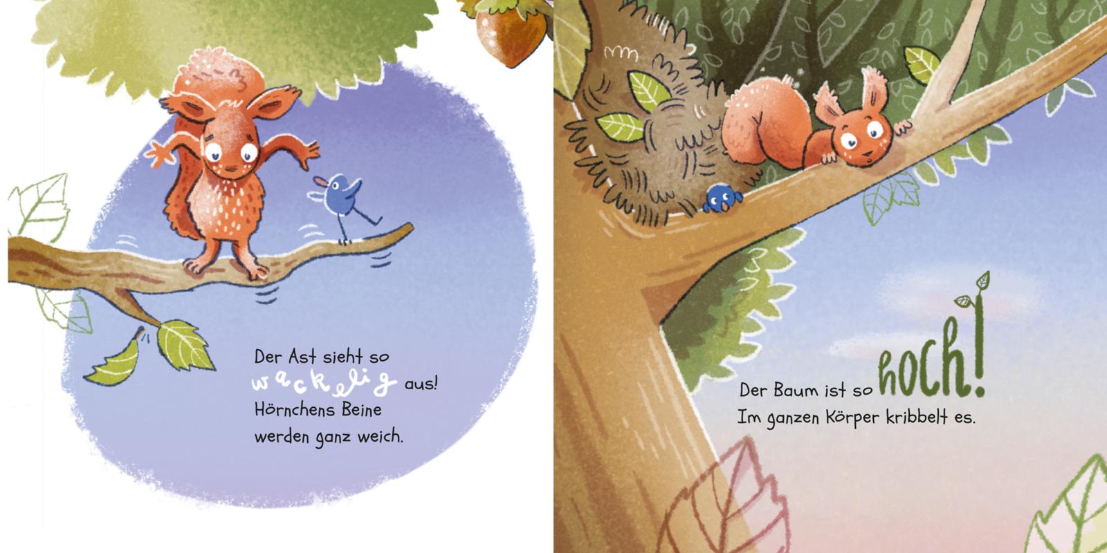 Hoch oben im Baum entdeckt das kleine Hörnchen seine Lieblingsnuss - nur einen Sprung entfernt. Doch Hörnchen traut sich nicht: Die Beine werden ganz weich, das Näschen zittert und im ganzen Körper kribbelt es. Der Ast ist so wackelig und der Baum so hoch! Doch dann... Ein Bilderbuch für Kinder ab 12 Monaten, das Mut macht und ein erstes Kennenlernen von Gefühlen liebevoll begleitet.