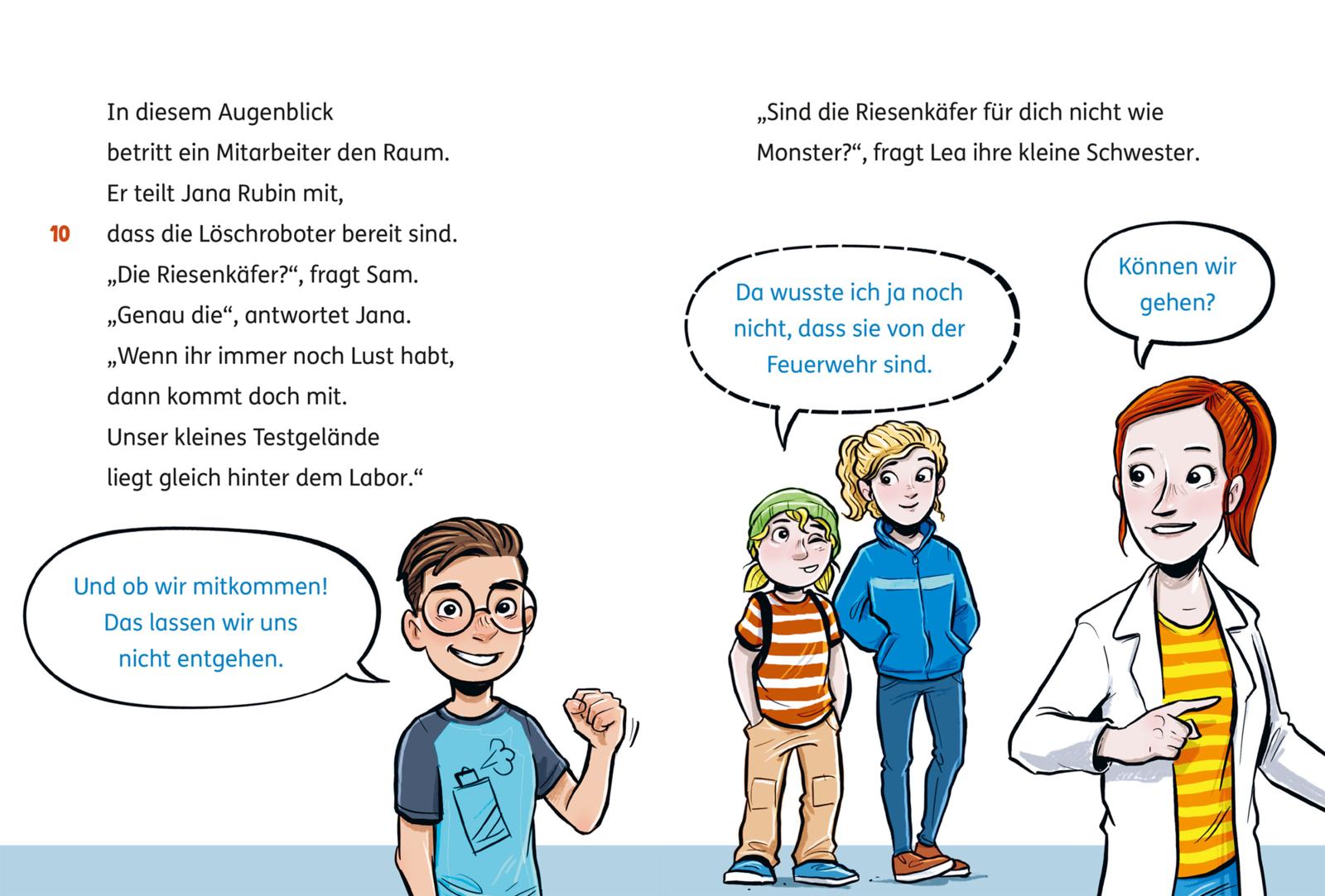 In Band 2 "Die Löschroboter" (ISBN 978-3551690210) testen die Kinder Löschroboter bei einem vorgetäuschten Waldbrand und kommen dabei ganz schön ins Schwitzen.