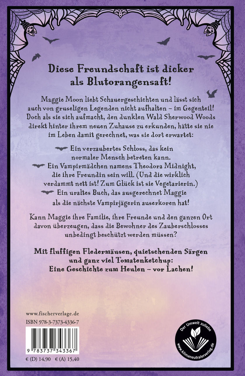 Maggie Moon wohnt seit kurzem mit ihren Eltern in einer alten Villa, direkt neben einem dunklen Wald. Der ist verflucht, sagen die Dorfbewohner. Was für ein Quatsch, sagt Maggie - über sowas kann sie nur lachen! Bei einer Erkundungstour macht Maggie jedoch eine unglaubliche Entdeckung: ein verzaubertes Schloss, in dem das Vampirmädchen Theodora Midnight lebt. Theodora ist echt nett - und zum Glück Vegetarierin. Schnell werden Theodora und Maggie beste Freundinnen. Doch ausgerechnet Maggie entstammt einer Familie von berühmten Vampirjägern. Kann sie ihre Familie und den gierigen Bürgermeister davon überzeugen, dass ihre nachtaktiven Nachbarn nicht gejagt, sondern beschützt werden müssen?