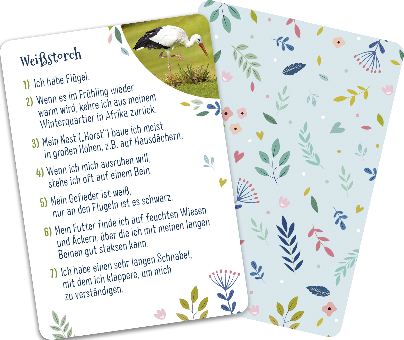 In dem lustigen Spiel für Kinder ab 6 Jahren müssen für den Frühling typische Tiere und Pflanzen erraten werden. Nacheinander werden bis zu sieben Hinweise vorgelesen, die immer konkreter werden, bis die Lösung gefunden ist: »Wer bin ich? Ich habe Flügel. Wenn ich mich ausruhen will, stehe ich oft auf einem Bein. Ich habe einen sehr langen Schnabel, mit dem ich klappere, um mich zu verständigen.«. Das liebevoll gestaltete Wissensspiel garantiert viel Spaß für Groß und Klein und vermittelt dabei spielerisch das erste Grundschulwissen über die heimische Natur.