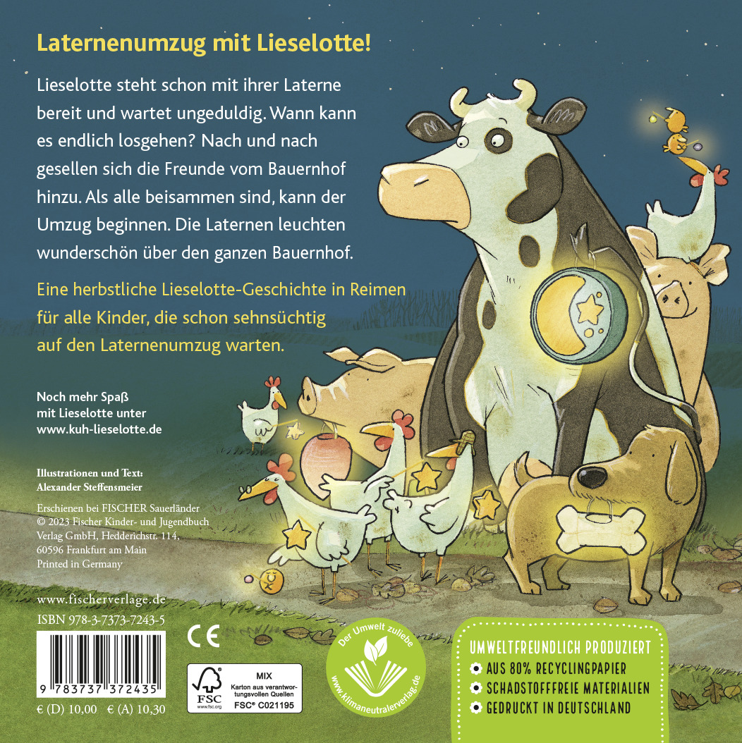 Lieselotte freut sich schon seit Tagen auf den Laternenumzug. Ungeduldig wartet sie mit ihrer selbstgebastelten Laterne vor dem Stall, obwohl es noch gar nicht dunkel ist. Wo bleiben bloß ihre Freunde vom Bauernhof? Als endlich Hund und Hühner beisammen sind, kann der Umzug starten und die Laternen beginnen im Dunkeln zu strahlen. Eine herbstliche Lieselotte-Geschichte in Reimen für alle Kita-Kinder, die schon sehnsüchtig auf den Laternenumzug warten.