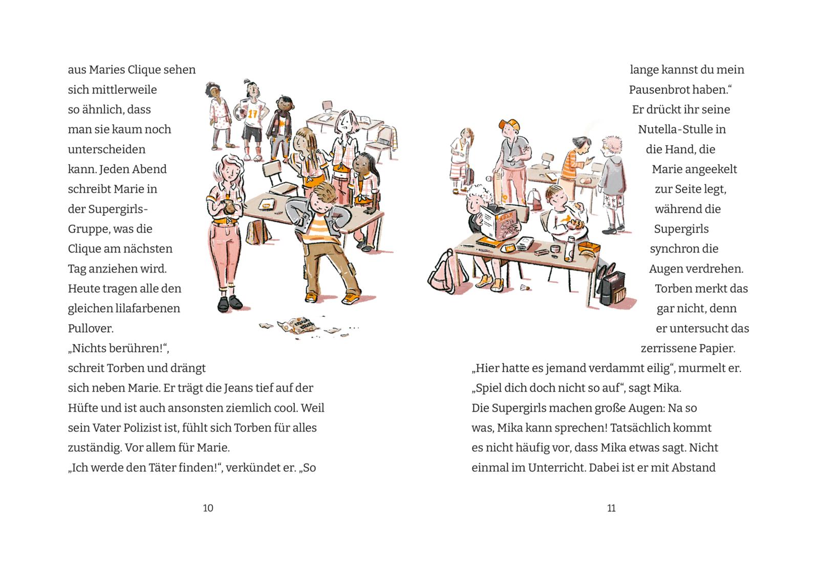 Marie bebt vor Wut. Es ist bereits das zweite Mal in dieser Woche, dass ihr Schulbrot weg ist. Und nicht irgendein Schulbrot. Maries Mutter erschafft jeden Morgen ein anderes Wunderwerk und packt es in braunes Öko-Papier mit dem Aufdruck "Super essen, super leben!" Zum Beispiel Vollkornbrot mit Auberginen-Couscous-Petersilien-Aufstrich. Oder Kürbisbrot mit Rucola und Pinienkernen. Marie ist stolz auf ihre Supersandwiches, denn niemand in der Klasse hat so tolle Brote wie sie. Aber jetzt liegt das Öko-Papier zerrissen neben Maries Schulrucksack auf dem Boden. Nur die Wörter "Super super" sind noch lesbar. Das Sandwich ist weg.