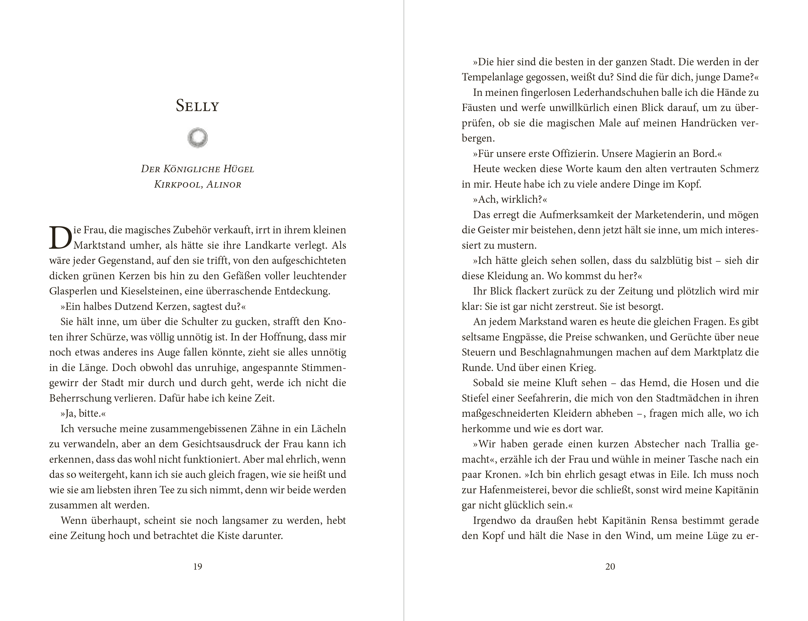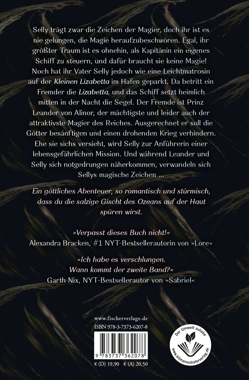 Selly ist nur ein Schiffsmädchen auf der Kleinen Lizabetta, aber sie träumt davon, eines Tages selbst Kapitänin zu sein. Da betritt ein Fremder das Schiff, und mitten in der Nacht setzen sie heimlich die Segel. Der Fremde ist Prinz Leander von Alinor, der mächtigste und leider auch der attraktivste Magier des Reiches. Ausgerechnet er soll die Götter besänftigen und einen drohenden Krieg verhindern? Ehe sie sich's versieht, wird Selly zur Anführerin einer lebensgefährlichen Mission, und notgedrungen kommen Leander und Selly sich näher ...