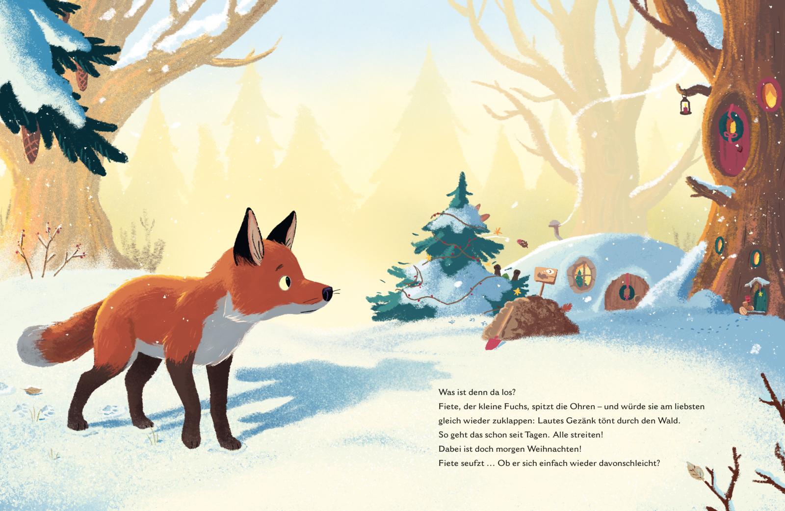 Der kleine Fuchs Fiete hält es im Wald kaum noch aus. Obwohl morgen Weihnachten ist, streiten die Tiere ununterbrochen! Moment mal - was ist das denn für ein Geräusch? Trotz lautem Piepen, Krächzen und Zanken hört Fiete ein leises Fiepen im Unterholz. Als die Tiere der Sache gemeinsam auf den Grund gehen, finden Sie im Schnee einen bibbernden wuscheligen Hund.