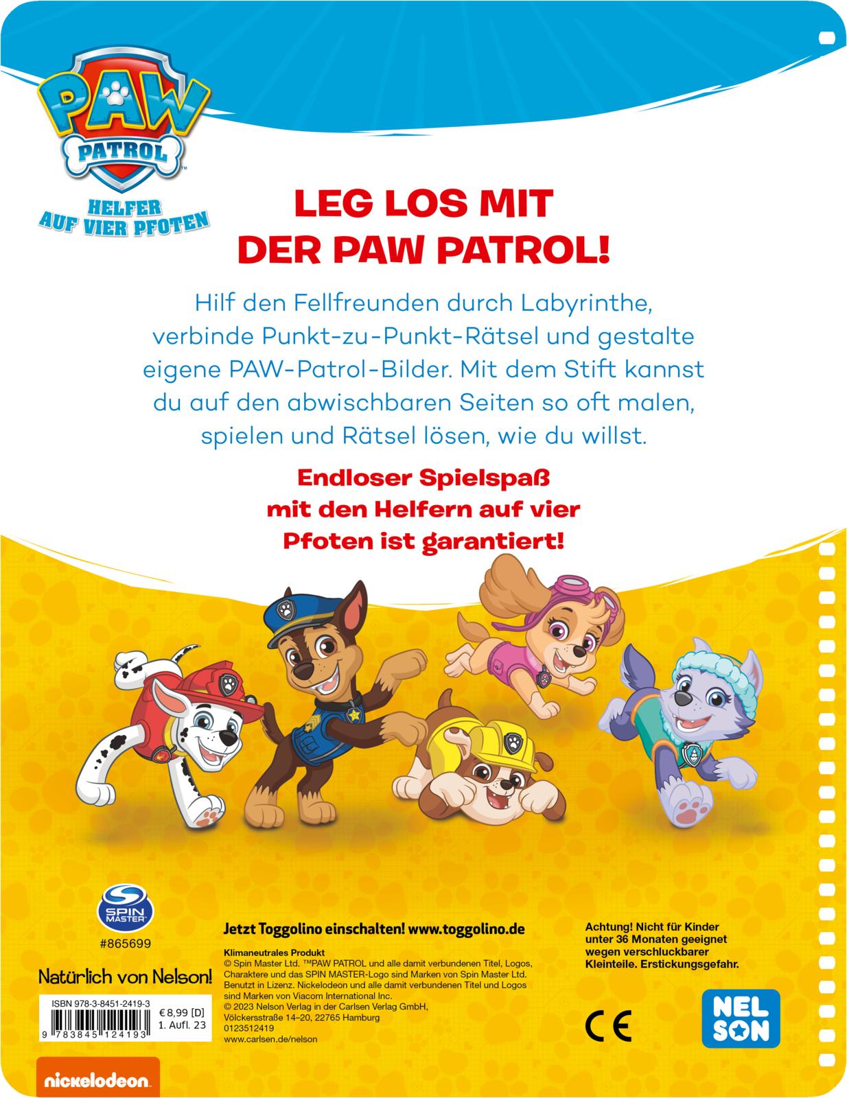 Endloser Spiel- und Lernspaß: Mehr als 30 Aufgaben zum Malen und Rätseln rund um die PAW Patrol können dank der abwischbaren Seiten mit dem beiliegenden Stift immer wieder gelöst werden.