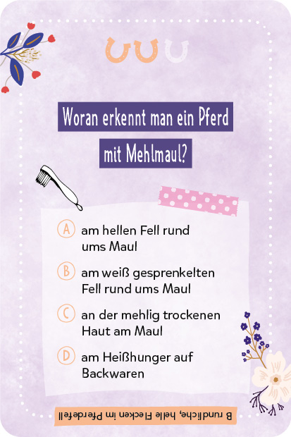 In diesem pferdestarken Quizspiel erwarten dich über 120 Fragen in drei Schwierigkeitsstufen. Teste dein Wissen: Wie viel weißt du über Pferde und wie gut kennst du Lia und Lea? Ein spannendes Wissensquiz für alle Fans der beliebten YouTuberinnen: Wie viele Zähne hat ein erwachsenes Pferd? Welche Farbe hat Alfi? Was für einen Haken sollte man zum Führen am Halfter verwenden? Mit versteckten Lösungen auf jeder Karte ist Schummeln ausgeschlossen! Das perfekte Geschenk für alle Pferde-Fans!