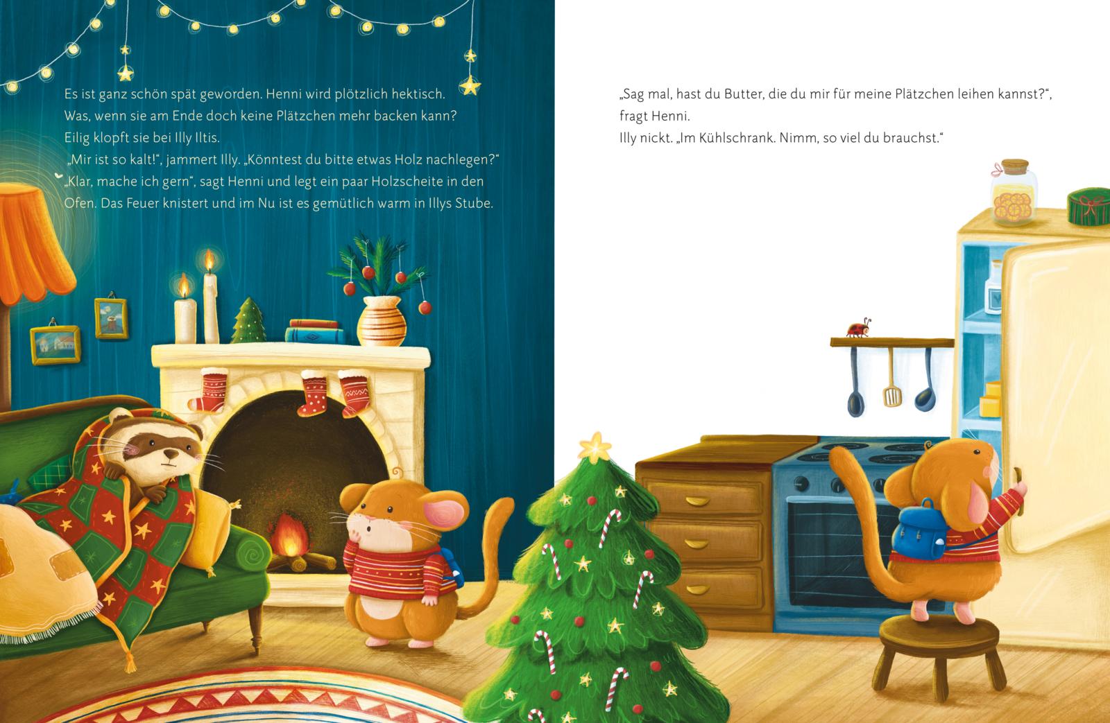 Henni Haselmaus möchte Weihnachtsplätzchen für alle Tiere im Baumhaus backen. Doch, oh Schreck, die Vorratskammer ist leer! Wo soll Henni heute, an Heiligabend, denn noch Zutaten für die Kekse bekommen? Ein Weihnachtsfest ohne Plätzchen, das wäre undenkbar. Also macht sich die kleine Haselmaus auf den Weg. Die Nachbarstiere helfen ihr gerne aus. Henni hilft ihnen im Gegenzug beim Dekorieren, bei der Kinderbetreuung, bei der Musikprobe, und, und, und. Ob die Zeit am Ende noch zum Backen reicht?