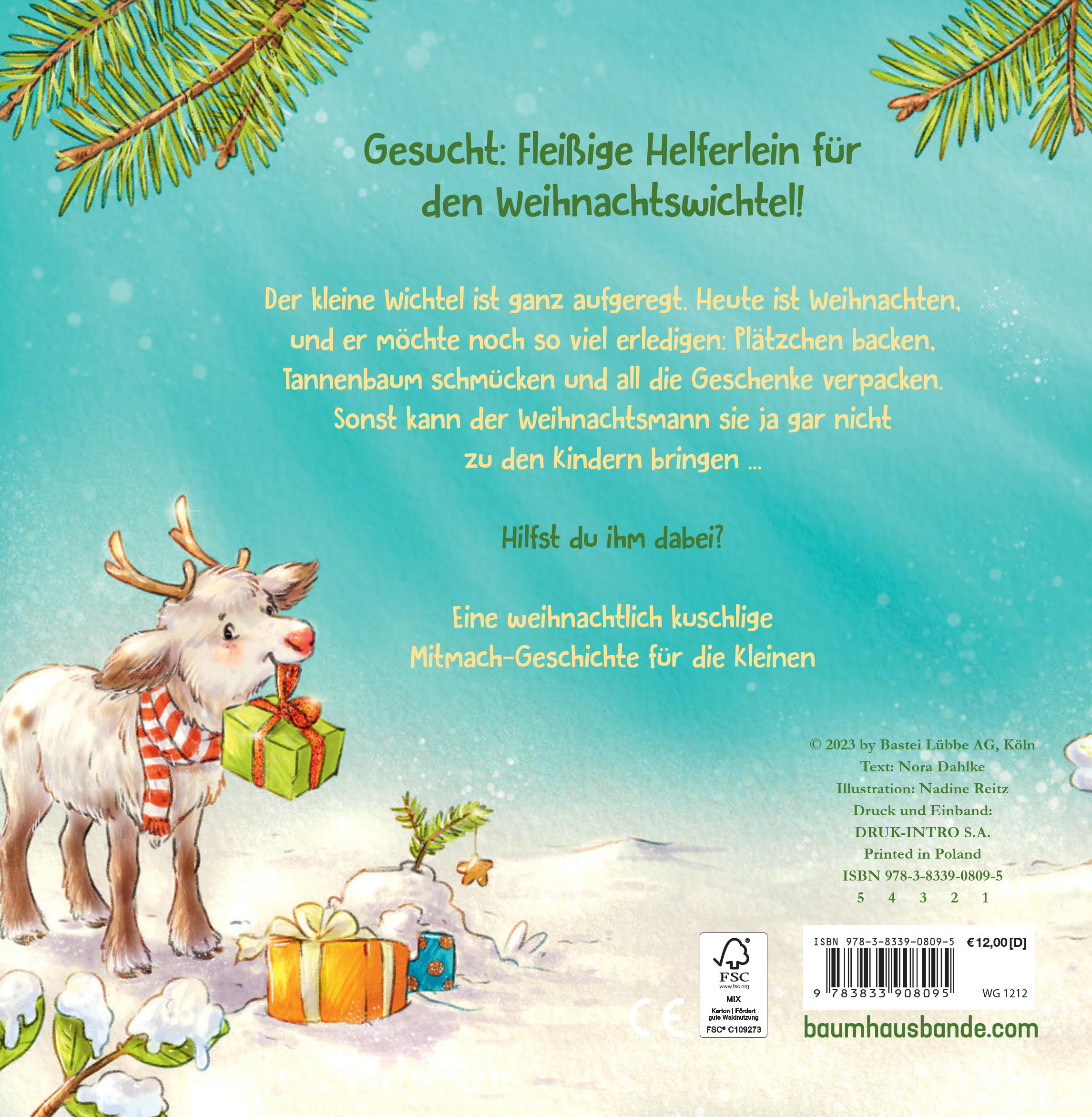 Gesucht: Fleißige Helferlein für den Weihnachtswichtel! Der kleine Wichtel ist ganz aufgeregt. Heute ist Weihnachten, und er möchte noch so viel erledigen: Plätzchen backen, Tannenbaum schmücken und all die Geschenke verpacken. Sonst kann der Weihnachtsmann sie ja gar nicht zu den Kindern bringen ... Hilfst du ihm dabei?Eine weihnachtlich kuschlige Mitmach-Geschichte für die Kleinen ab 2 JahrenKlare Sprache und einfache, kurze Aufforderungen z. B. zum Pusten, Rühren, Küsschen gebenWichtiges Thema im Familien-Alltag mit Kleinkindern: Weihnachten und AdventsbräucheMit herzerwärmenden Bildern der Bestseller-Illustratorin Nadine ReitzDie Bilder laden zum Entdecken und Verweilen ein - für gemütliche Vorlesestunden in der VorweihnachtszeitGemacht für Kinderhände: dicke Pappseiten und handliches FormatDas perfekte Geschenk für die Adventszeit und zu Weihnachten!