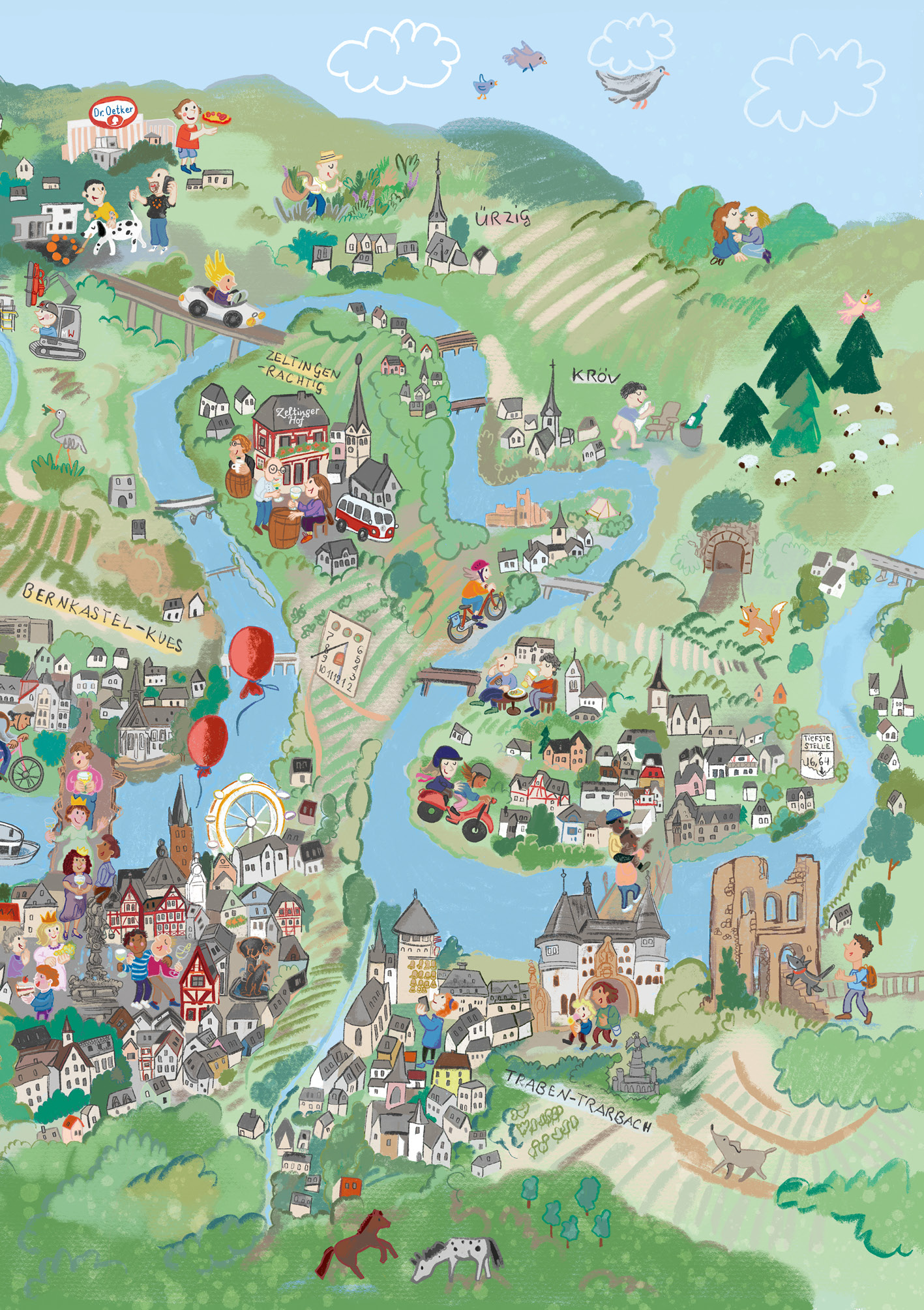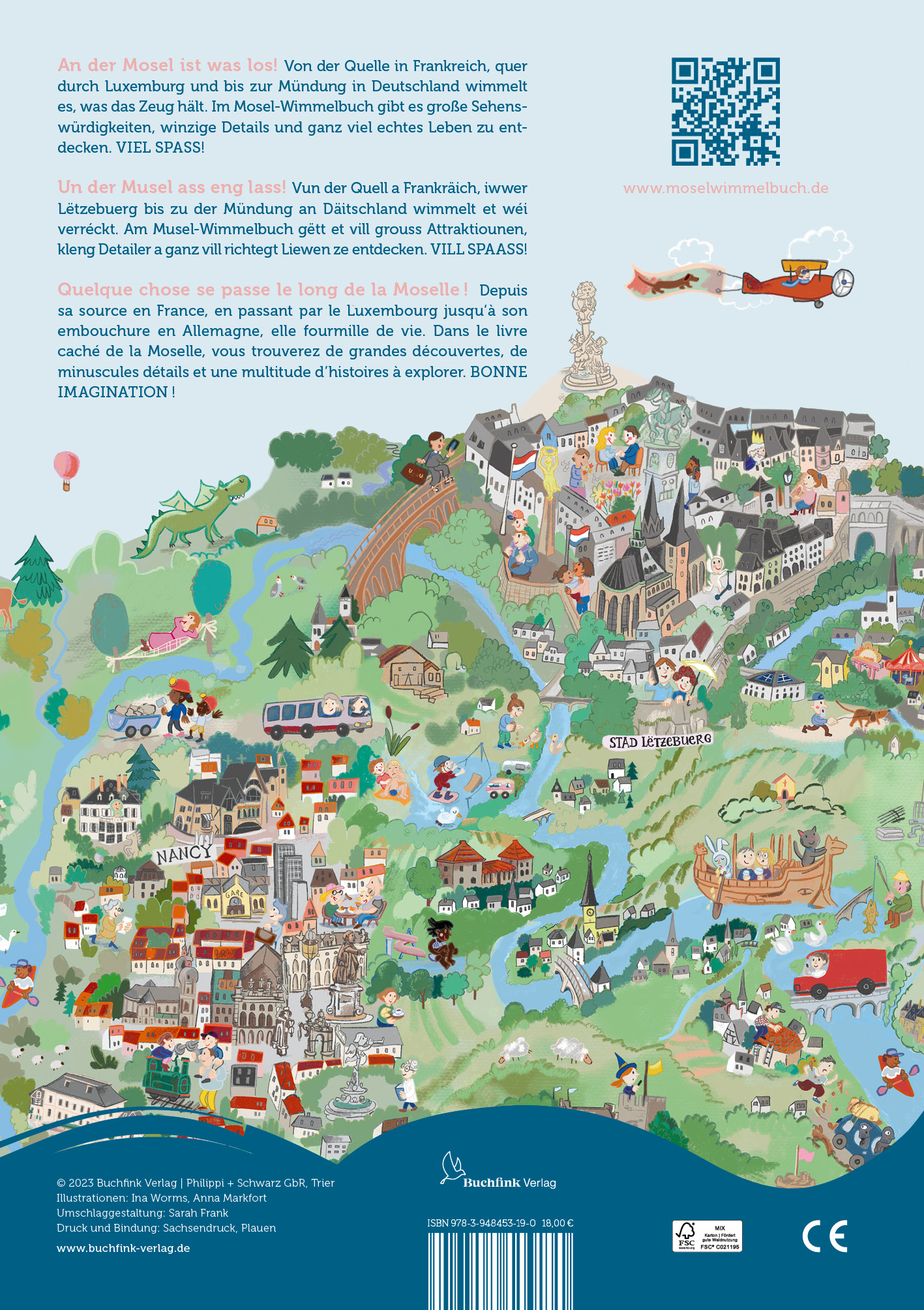 An der Mosel ist was los! Von der Quelle in Frankreich, quer durch Luxemburg und bis zur Mündung in Deutschland wimmelt es, was das Zeug hält. Im Mosel-Wimmelbuch gibt es große Sehenswürdigkeiten, winzige Details und ganz viel echtes Leben zu entdecken. VIEL SPASS!Un der Musel ass eng lass! Vun der Quell a Frankräich, iwwer Lëtzebuerg bis zu der Mündung an Däitschland wimmelt et wéi verréckt. Am Musel-Wimmelbuch gëtt et vill grouss Attraktiounen, kleng Detailer a ganz vill richtegt Liewen ze entdecken. VILL SPAASS!Quelque chose se passe le long de la Moselle ! Depuis sa source en France, en passant par le Luxembourg jusqu'a son embouchure en Allemagne, elle fourmille de vie. Dans le livre cache de la Moselle, vous trouverez de grandes découvertes, de minuscules de tails et une multitude d'histoires a explorer. BONNE IMAGINATION !