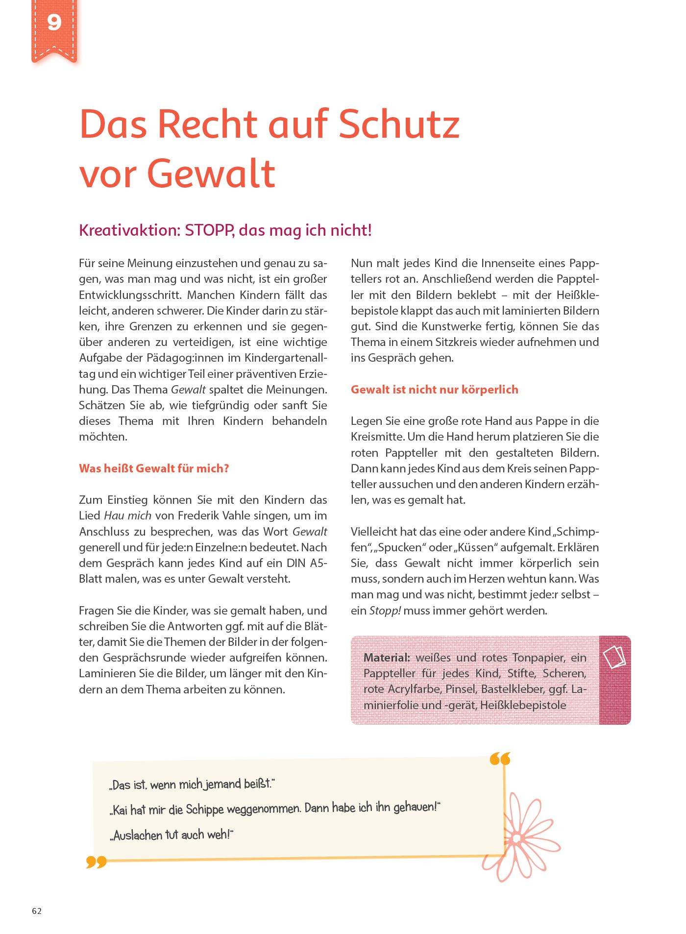 | Schlagworte | Diversität • Gewaltfreie Kommunikation • Gewaltfreiheit • Kindergarten • Kinderrechtskonvention • Kinderschutz • Kindeswohl • Kindeswohlgefährdung • Kita • Konzeption • Prävention • Praxisideen • Schutzkonzept |