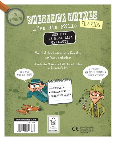 Wer hat das berühmteste Gemälde der Welt gestohlen?Bei diesem witzigen Kriminalfall ist das Museum dringend auf die Hilfe von Sherlock Holmes, Watson und Hund Schlingel angewiesen. Die bunt illustrierten Wort-, Buchstaben- und Zahlenrätsel schulen Kombinatorik, Gedächtnis und genaues Hinsehen. Jedes Rätsel offenbart weitere Hinweise, die am Ende zur Überführung des Täters führen.Knobeleien und Unterhaltung für junge Rätselfreunde - rund um den berühmtesten Detektiv der Welt!-Diebstahl der Mona Lisa? - ein Fall für Sherlock Holmes zum Selberlösen-Suchbilder, Rätselfragen, Zahlen- und Buchstabenrätsel führen zum Ziel-Detektivgeschichte mit Knobelaufgaben für Kinder ab 7 Jahren