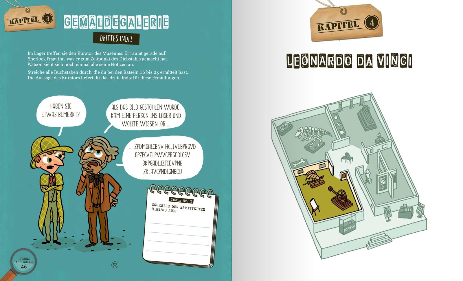 Ein lustiger Kriminalfall in einem Museum zum Mitmachen, jede Seite vierfarbig, mit verschiedenen Bilder-, Buchstaben- und Zahlenrätseln für junge Detektive und Rätselfans.