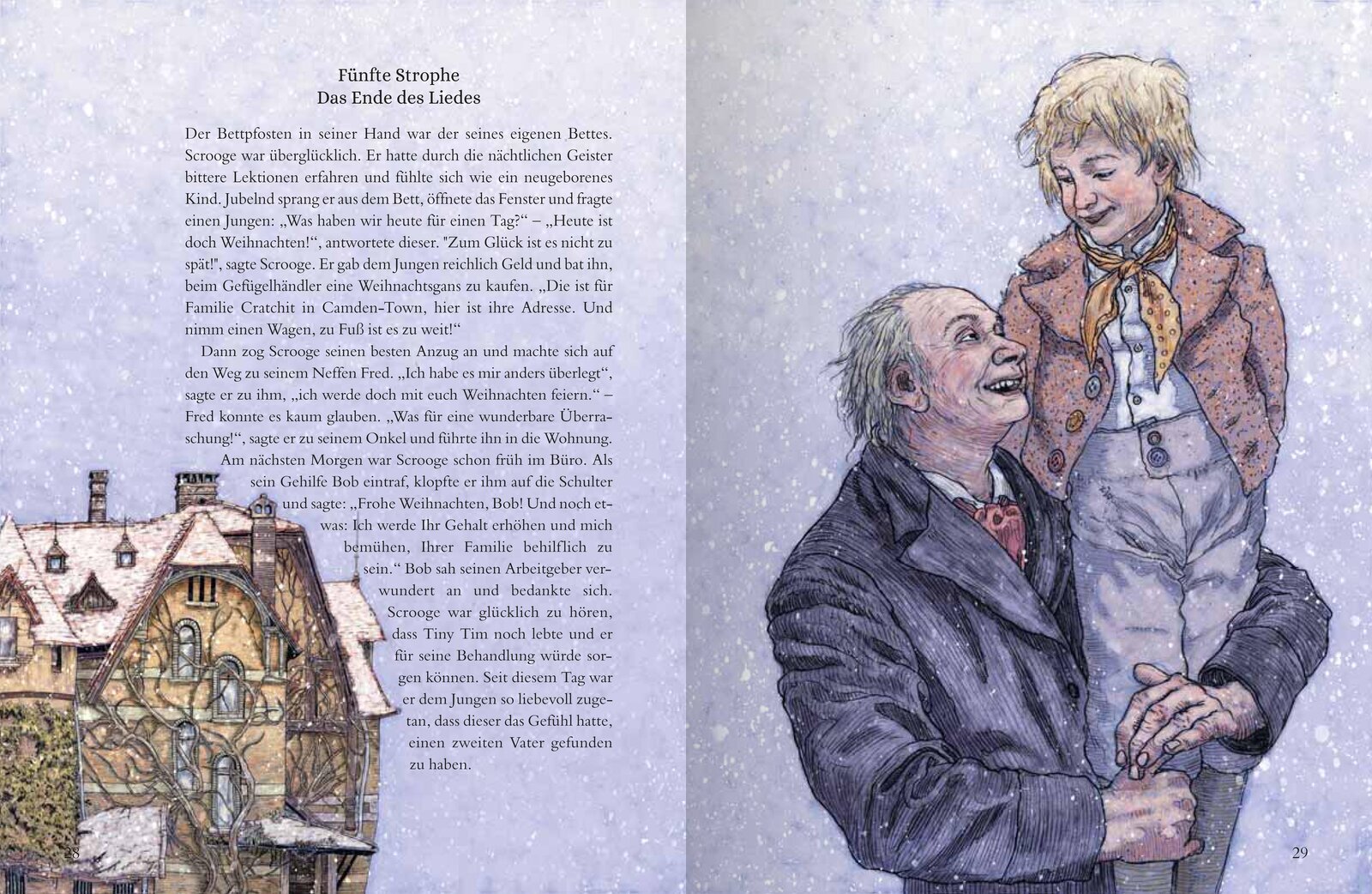 Der hartherzige Scrooge wird durch den weihnachtlichen Besuch von drei Geistern zu einem guten Menschen. Ein besinnlicher Vorlese-Klassiker zur Weihnachtszeit, stimmungsvoll illustriert von Tim Köhler