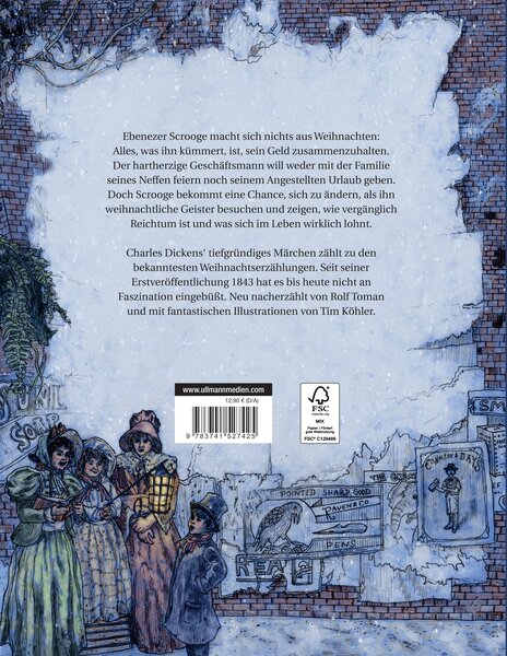Der Geschäftsmann Ebenezer Scrooge macht sich nichts aus Weihnachten: Alles, was ihn kümmert, ist, sein Geld zusammenzuhalten. Der hartherzige Mann will weder mit der Familie seines Neffen Fred feiern noch seinem Angestellten bezahlten Urlaub geben. Doch Scrooge bekommt eine Chance, sich zu ändern, als ihn weihnachtliche Geister besuchen und zeigen, wie vergänglich der Reichtum ist und was sich im Leben wirklich lohnt. Charles Dickens' tiefgründiges Märchen zählt zu den bekanntesten Weihnachtserzählungen. Seit seiner Erstveröffentlichung 1843 hat es bis heute nicht an Popularität und Faszination eingebüßt. Neu nacherzählt von Rolf Toman und mit fantastischen Illustrationen von Tim Köhler.-Charles Dickens' Weihnachtsklassiker um den alten Scrooge, neu nacherzählt und bebildert-Tolle, atmosphärische Illustrationen für stimmungsvolle Vorleseerlebnisse-Eine Geschichte, die nach Empathie und Nächstenliebe in den Mittelpunkt des Lebens stellt
