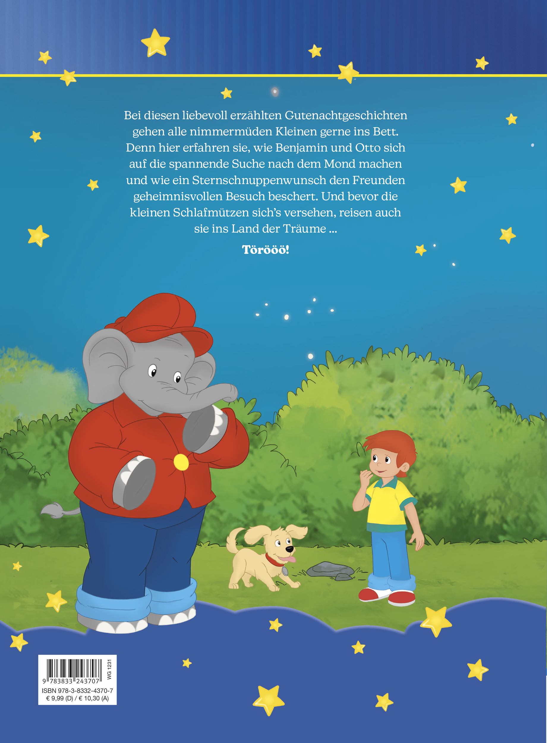 Bei diesen liebevoll erzählten Gutenachtgeschichten gehen alle nimmermüden Kleinen gerne ins Bett. Denn hier erfahren sie, wie Benjamin und Otto sich auf die spannende Suche nach dem Mond machen und wie ein Sternschnuppenwunsch den Freunden geheimnisvollen Besuch beschert. Und bevor die kleinen Schlafmützen sich's versehen, reisen auch sie ins Land der Träume ... Törööö!
