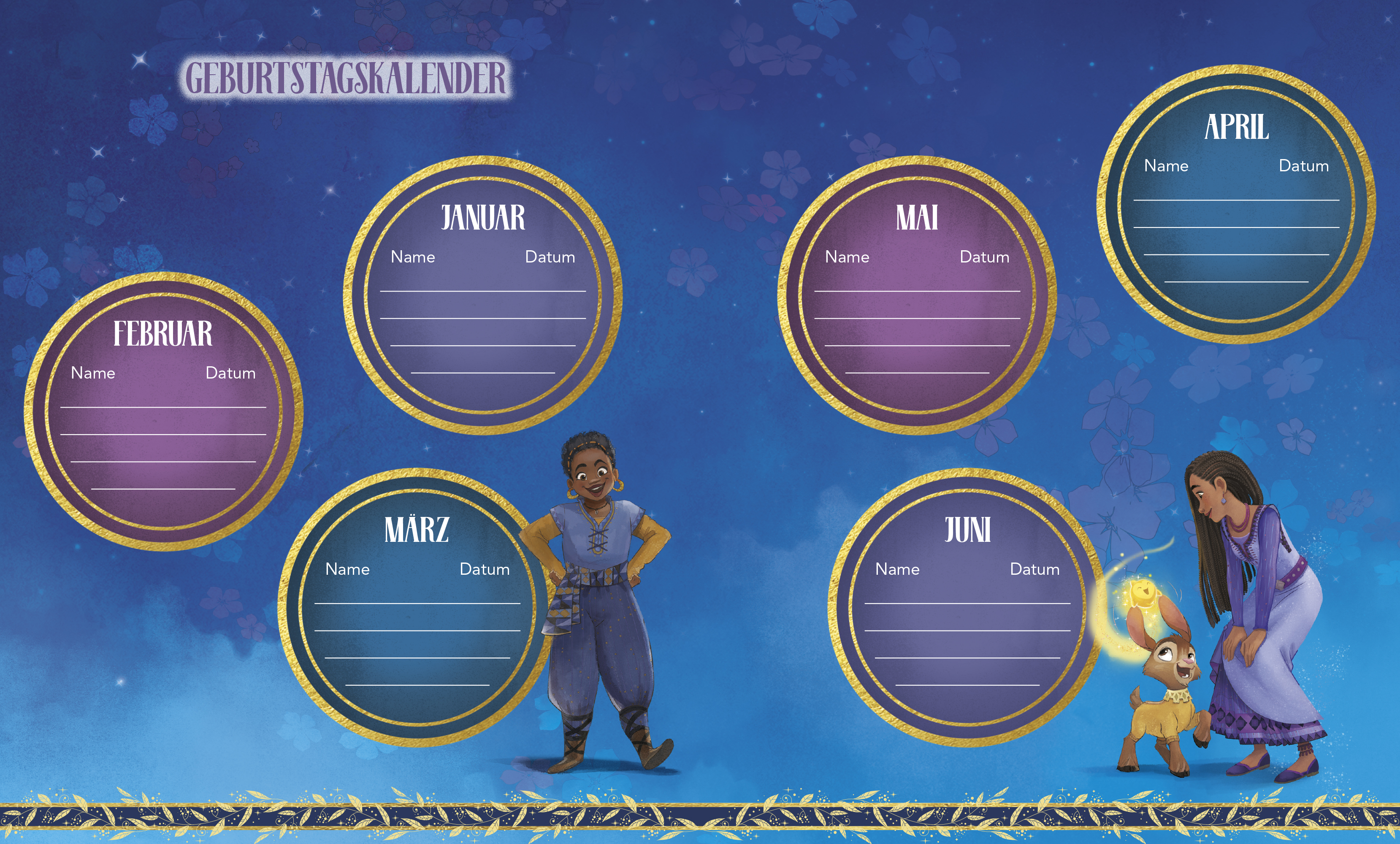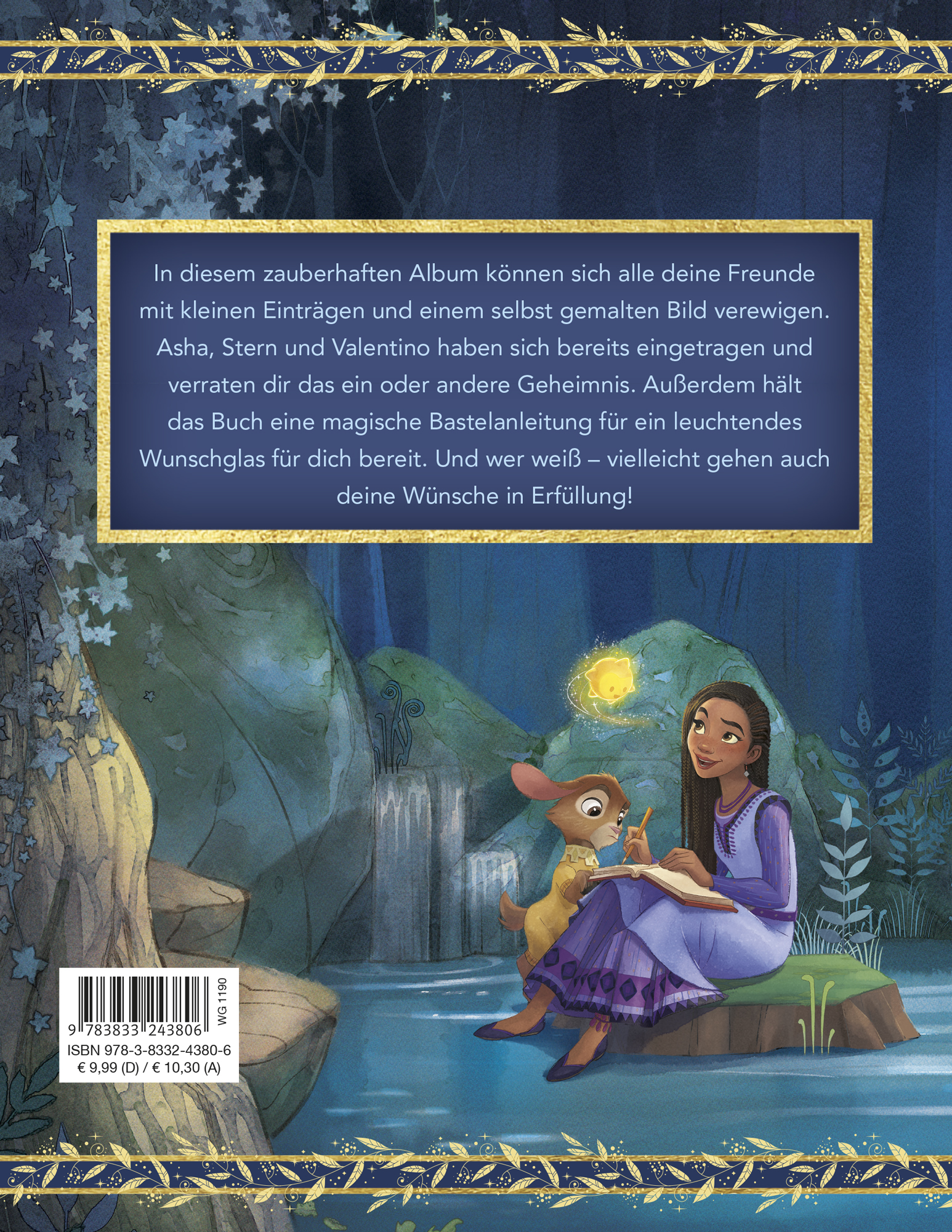 In diesem zauberhaften Album können sich alle deine Freunde mit kleinen Einträgen und einem selbst gemalten Bild verewigen. Asha, Stern und Valentino haben sich bereits eingetragen und verraten dir das ein oder andere Geheimnis. Außerdem hält das Buch eine magische Bastelanleitung für ein leuchtendes Wunschglas für dich bereit. Und wer weiß - vielleicht gehen auch deine Wünsche in Erfüllung!