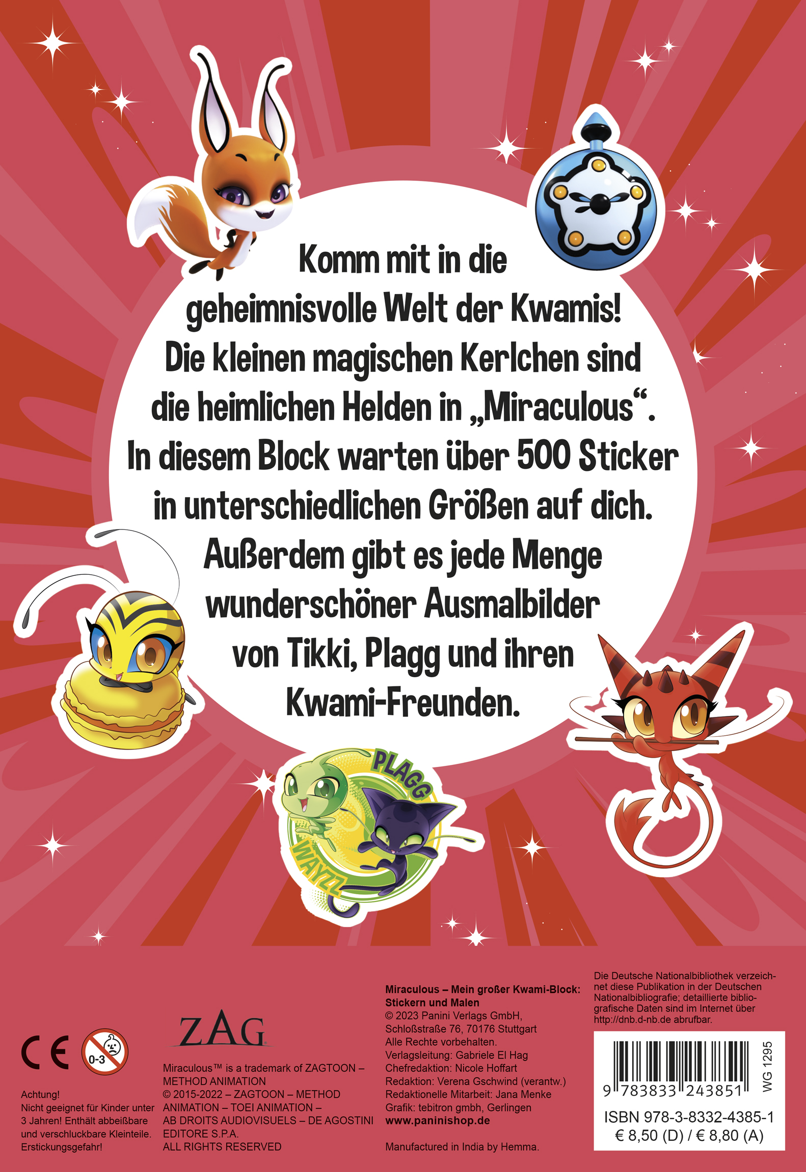Komm mit in die geheimnisvolle Welt der Kwamis! Die kleinen magischen Kerlchen sind die heimlichen Helden in "Miraculous". In diesem Block warten über 500 Sticker in unterschiedlichen Größen auf dich. Außerdem gibt es jede Menge wunderschöner Ausmalbilder von Tikki, Plagg und ihren Kwami-Freunden.